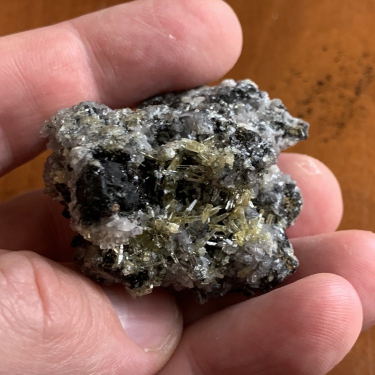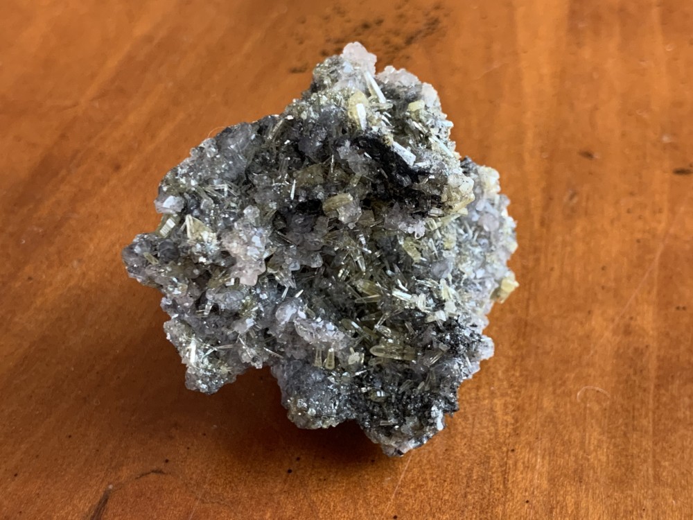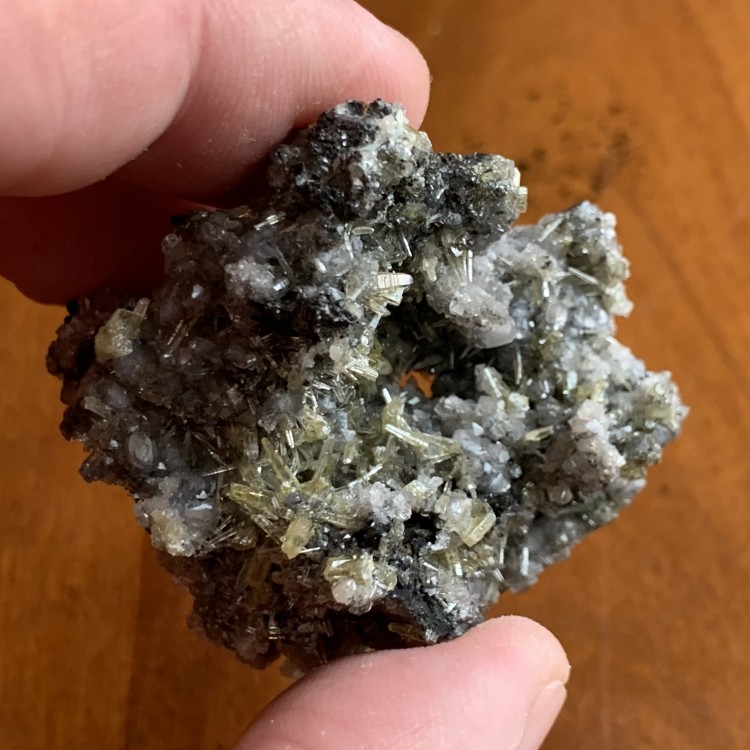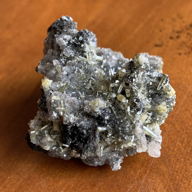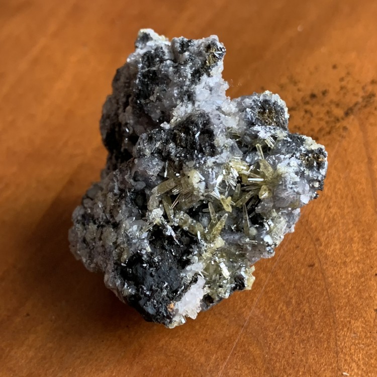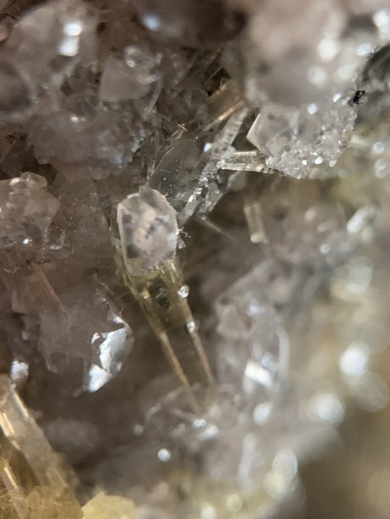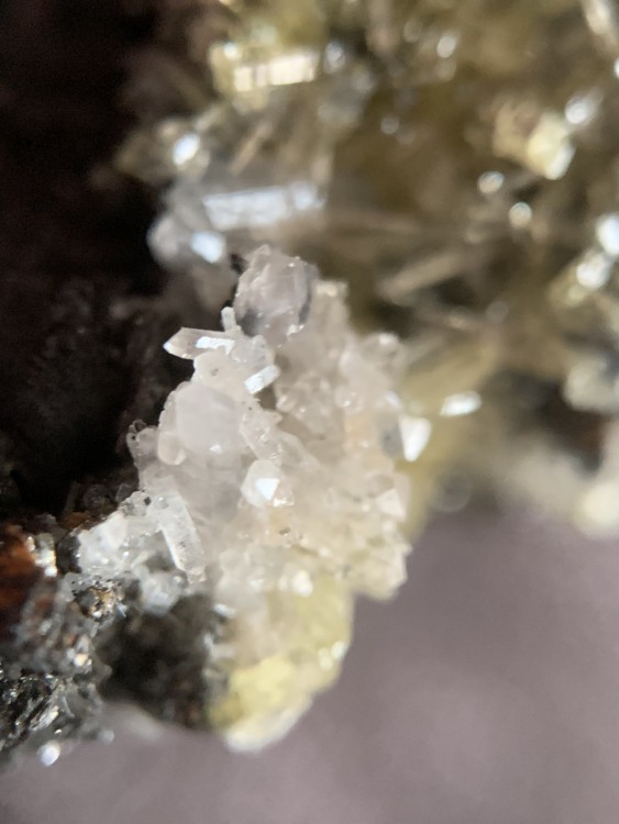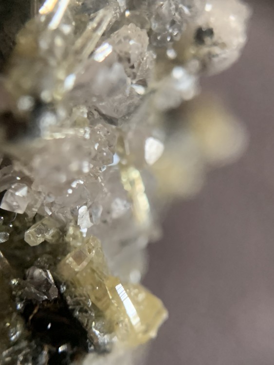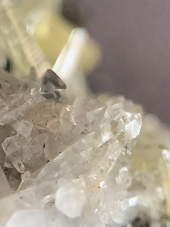 Oui elle m’avait tapé dans l’oeil c’est pour cela que j’avais craqué il y a quelques temps maintenant. Je t’avouerai que je ne sais pas trop, quartz non, il ne me semble pas y en avoir. Par contre je distinque pas mal de cristallisations translucides en octaedres très petites plus ou mois. Bien formé et anarchique. c’est un melange de ce mineral de mimetite allant aussi du tranlucide au vert en passant pas des teintés jaunes. et une gangue très noire. -