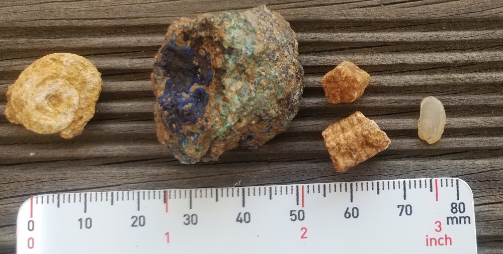 Petites trouvailles du weekend, près de Belmont dans le Sinémurien (mais en surface, donc je ne me risquerai pas à une datation individuelle). Un moule interne de gastéropode (j’ai assez peu de gastéropodes du coin), deux fragments de tiges de crinoïdes, mais surtout un splendide moule interne de lamellibranche en calcite, et un intrus, un caillou contenant azurite et malachite. Certes, je n’étais pas loin de Chessy, mais je ne pensais pas trouver ça ! -