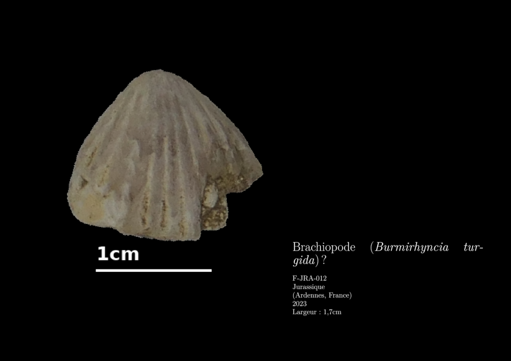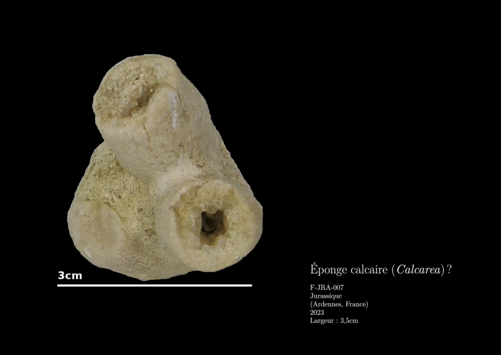 Oups, je n’ai pas répondu ! Je compte plutôt une vingtaine de côtes (un peu d’imprécision à cause de l’état du spécimen), donc plutôt I. thierarchensis. J’ai aussi trouve I. decorata sur ce site, et pour ces dernières, les côtes sont vraiment moins nombreuses. Selon la fiche géologique, on est sur du terrain remanié : "Formation d'altération et résiduelles". L’altération concerne potentiellement des couches géologiques d’âges variés. Les fossiles sont souvent pris ou bien dans une matrice calcaire blanche, ou bien dans de la pierre ocre, argileuse. Malheureusement mon manque de connaissances géologiques m’empêche d’en tirer plus de conclusions. J’essaie de trouver du temps pour me remettre à trier et identifier cette collection. Dans mes derniers spécimens, il y a ceci : J’ai plutôt l’impression qu’il s’agit d’une éponge calcaire, dont l’intérieur est rempli par la calcite. Je doute pouvoir en déterminer l’espèce au vu de l’usure, mais est-ce que quelqu’un confirme que c’est une éponge ? Géologie, Paléontologie et Paléoécologie du Bathonien du Sud-Ouest du Massif Ardennais par Jean-Claude Fischer cite deux espèces d’éponges calcaires, mais non identifiables. Edit : J’ajoute aussi ce brachiode. Il n’y a pas l’autre valve, et il semble plus plat que les autres, mais aussi plus érodé. Je compte 13 côtes, mais certaines sont potentiellement trop usées pour être visibles. Concernant F-JRA-04 ici, sur lequel je compte 17 côtes (avec potentiellement une ou deux en plus sur les bords). J’aurais donc tendance à plutôt le rattacher à Isjuminella thierachensis. P.S. : Je vois sur Mindat qu’Isjuminella thierachensis est devenu Burmirhynchia thierachensis. -