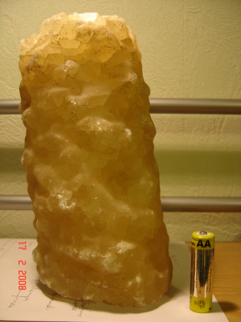 Je suis tout nouveau sur votre forum et ce qui m'y amène est un bloc minéral de couleur jaune translucide. Sa forme est cylindrique, à chaque extrémité (cassée) on peut voir la structure interne radiale des cristaux, alors que la surface est bosselée et satinée au toucher. Masse 3kg pour 18 cm de longueur et environ 9cm de diamètre (irrégulier). J'ai trouvé ce bloc dans le terrain autour de ma maison à Bergerac en Dordogne. Je n'ai aucune idée de sa provenance mais il y a de fortes chances que ça y ait été apporté par un ancien locataire (trouvé au milieu de gravats, non enfoui). Je n'ai pas effectué de test plus poussé mais la "bêête" n'a pas d'odeur ou de goût notable.
