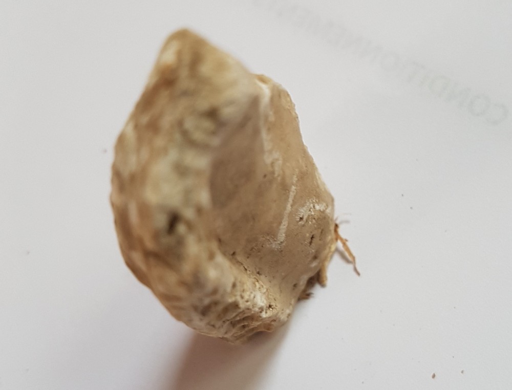 Le bord (photo 2 ) est arrondi, poli Les traces plus claires sont dues à des frottements possiblement dus au matériel de culture avec les cailloux et silex du champs -