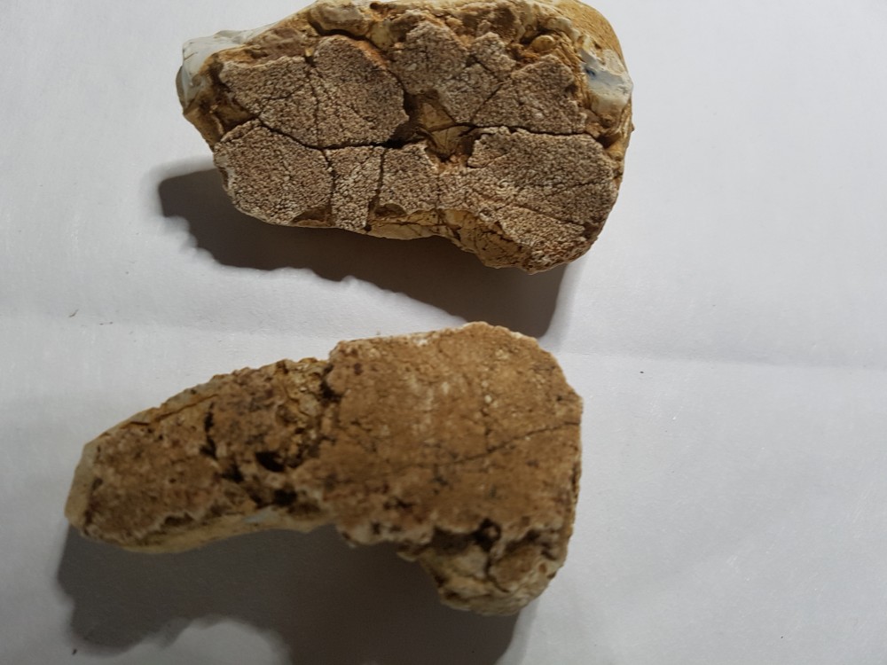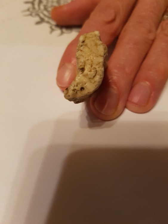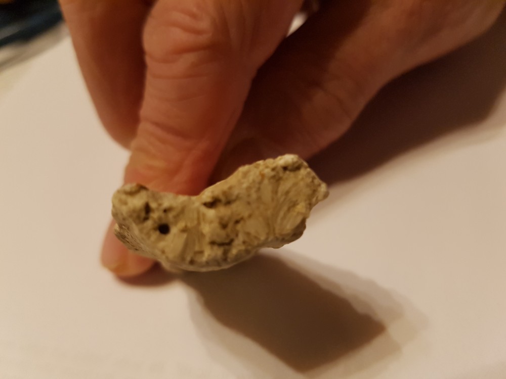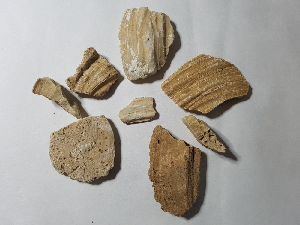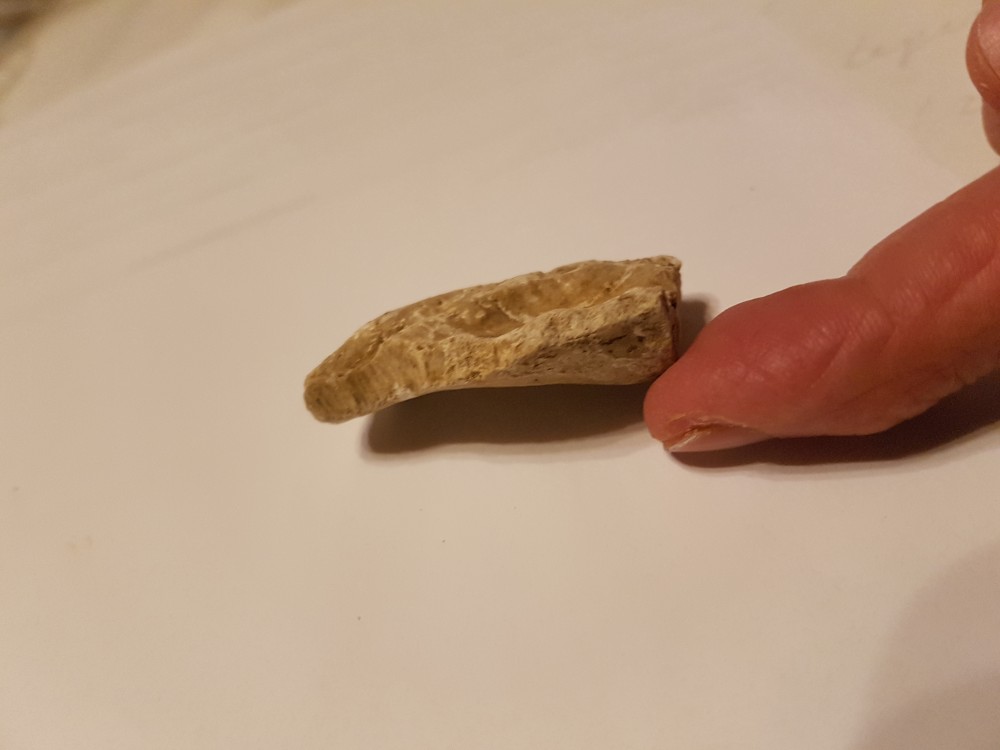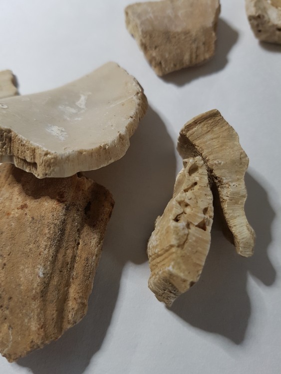 Voilà des morceaux récoltés qui pour moi sont les traces de coquilles ce qui m'a fait penser dès le début à la même chose l'aspect qui m'a intrigué sont les parties concaves du bord et la forme rapidement courbe ainsi que le profil. Cependant la structure en coupe est identique aux morceaux ci dessus. Réaction positive instantanée à l'acide dont on voit la partie plus claire sur le morceau de la troisième photo et avant test sur la première photo. -