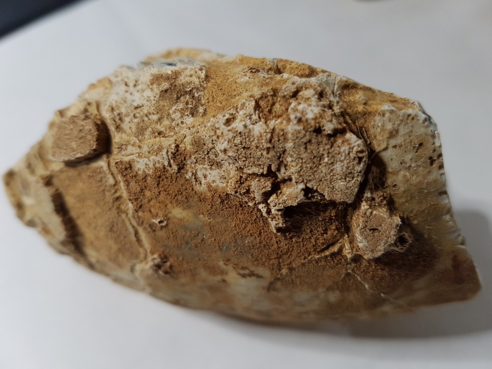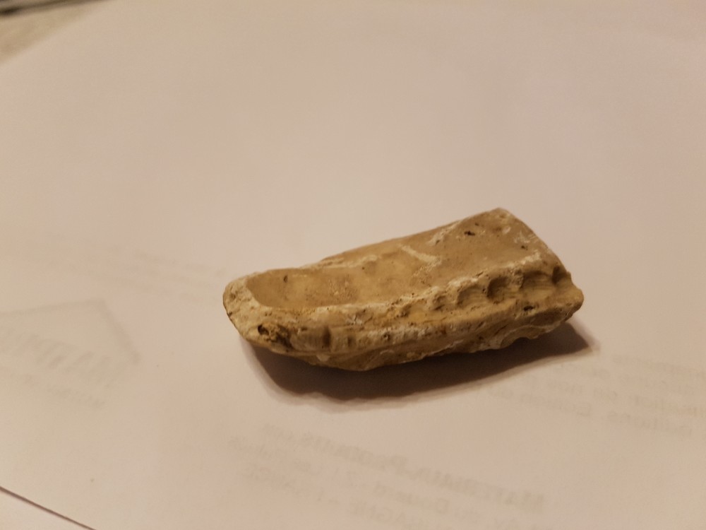 Estimation de la période début Eocène à fin crétacé supérieur Ressemble à une partie de mâchoire de poisson ou à un morceau de charnière de coquillage bien que la forme privilège une mâchoire... Estimation de la période géologique en fonction des fossiles présents et trouvés antérieurement.