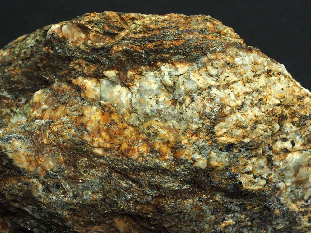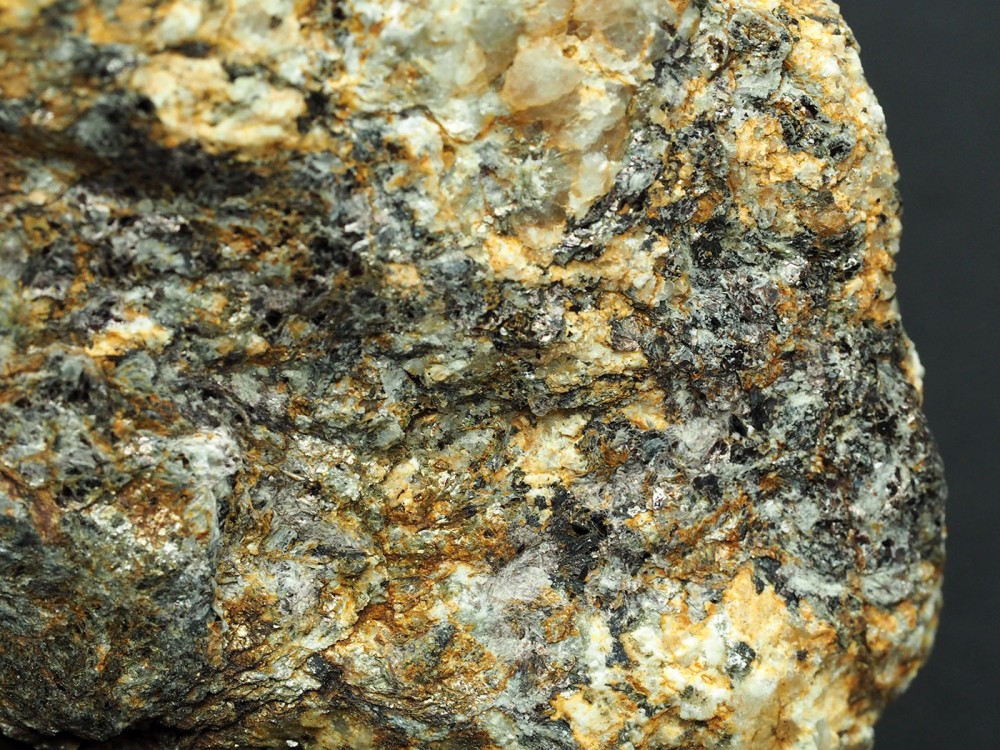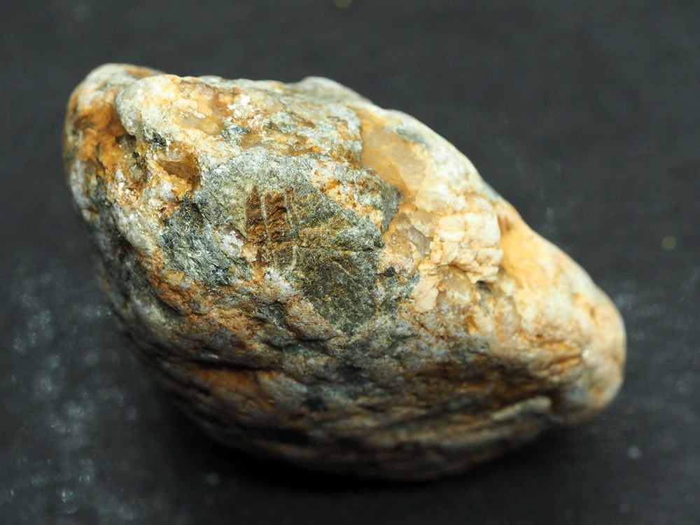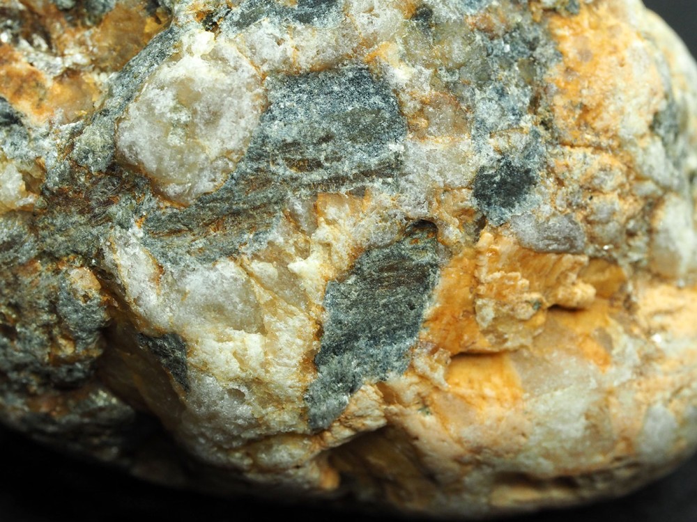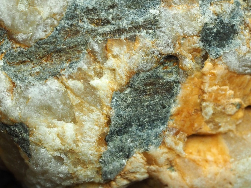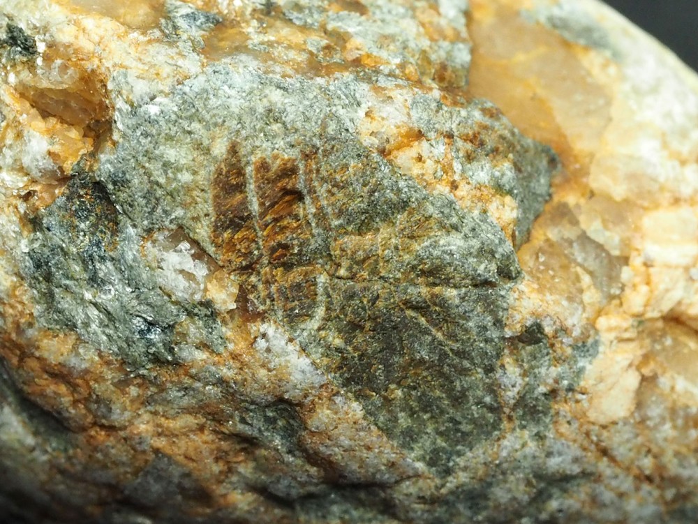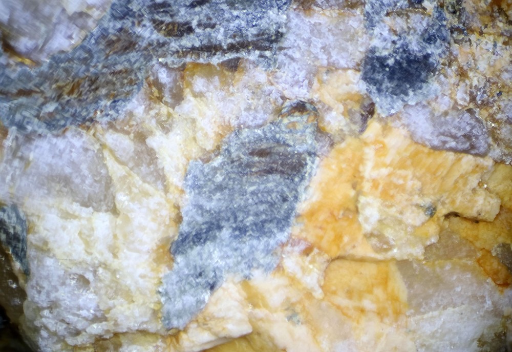 5 - Caillou à inclusions ? Celui-là je le poste parce qu'il me semble qu'à sa petite échelle il renvoie à une discussion d'hier et que je me demande également si il ne contiendrait pas de la cordiérite (minéral gris bleu en haut à droite des 3ème et 4ème images ?) ... ? Sinon, j'y verrais bien, sous toutes réserves, du quartz "en dents de requin", côté gauche au centre de ce bord, du feldspath jaunissant, peut-être, et ce qui serait peut-être englobé dans cette pâte, du "protolithe" varié (?), de couleur grise avec quelques bandes tirant sur le marron ... ? Vues macro au 60 mm olympus, avec crop, et macro à la bino (médiocre qualité, non cropable). -