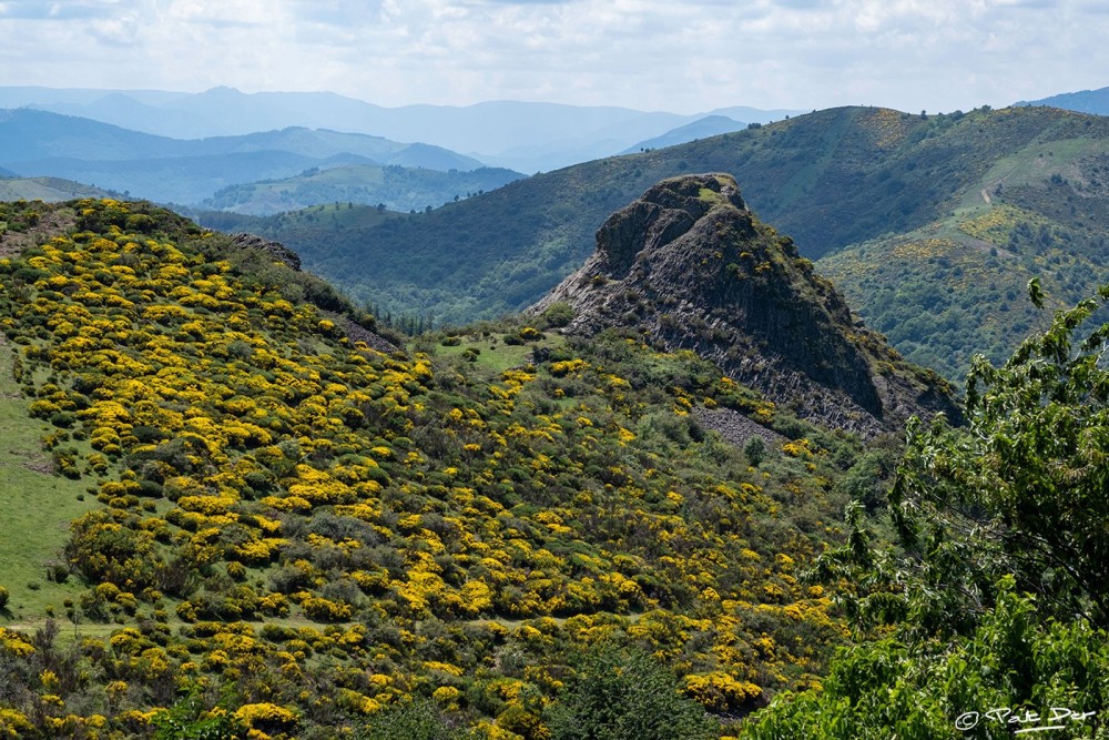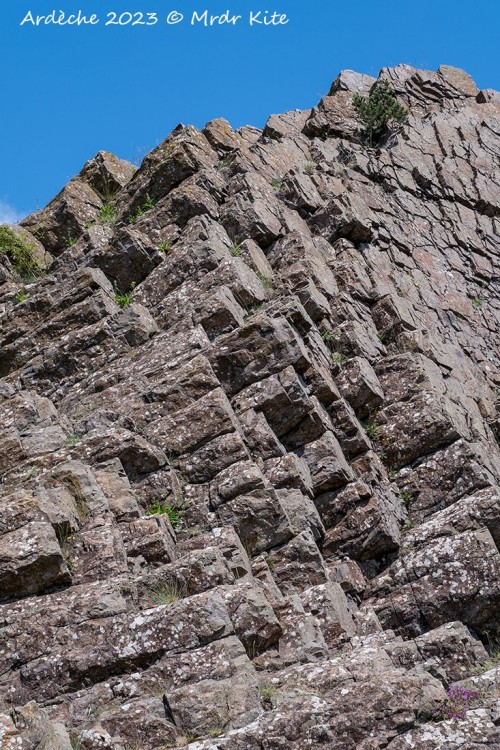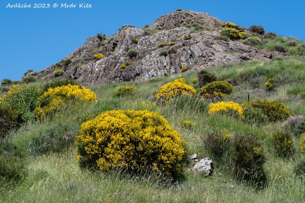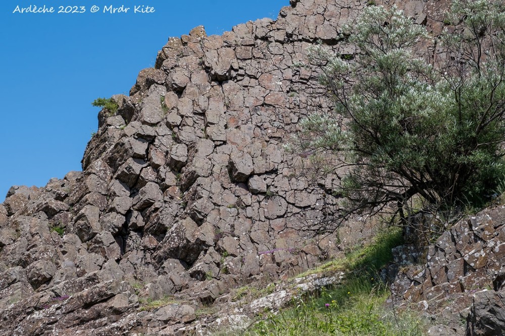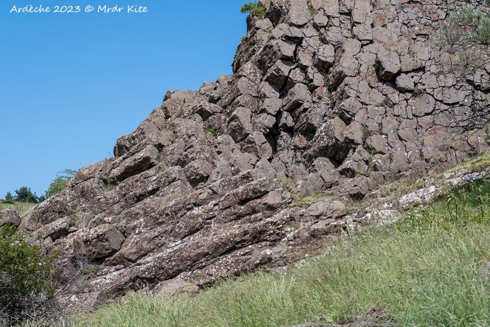 Un petit relief proche du GR nous a permis d'observer des orgues basaltiques, formations que je trouve très graphiques ... Internet et moi même ne pouvons hélas pas adresser aux lecteurs l'odeur entêtante des genêts purgatifs en fleurs. Si j'ai bien lu, ces formations sont associées à l'époque du volcanisme actif du Coiron. Le site est fréquenté par des troupeaux et donc ... par des tiques ... Méfi ! -