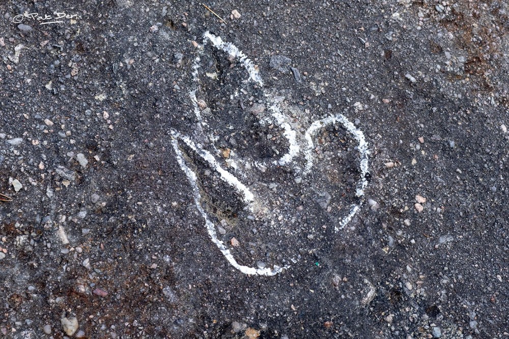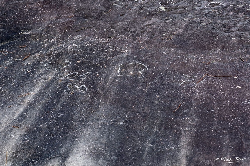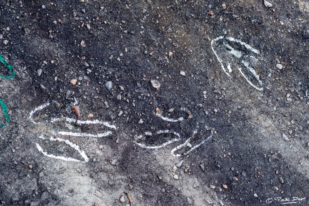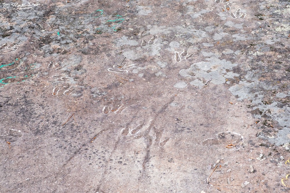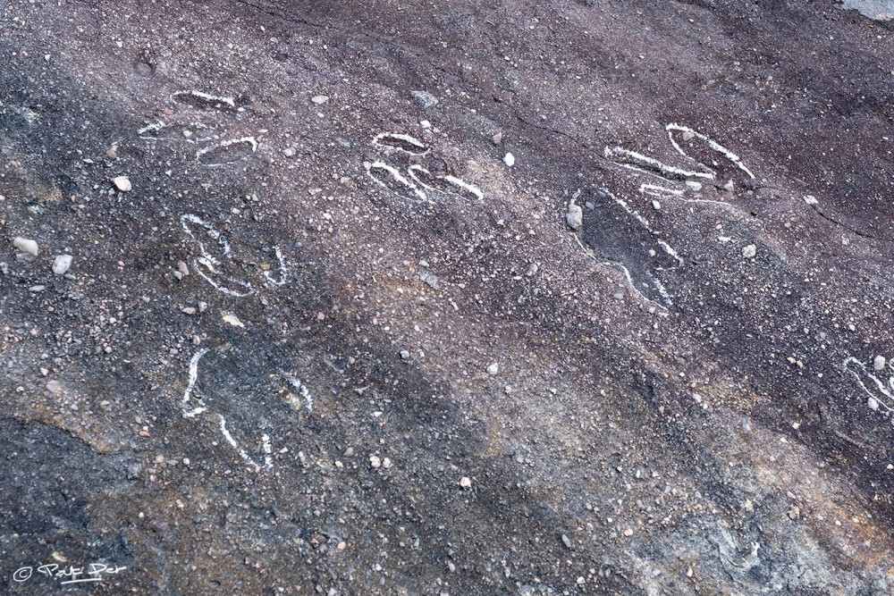 Troisième site présenté pour ces balades rapides : le Géosite à traces de dinosaures du Sartre à Ucel Le site est totalement aménagé ; j'ai l'impression qu'il a bénéficié de financements UNESCO (?). C'est compact, lié à une dalle inclinée de grès qui a conservée les traces des sous empreintes de dinosaures déposées il y a environ 220 millions d'années (Trias) si je me souviens bien. On évolue sur un ponton, sans endommager le site. Voici quelques unes des traces d'empreintes conservées et repérées en couleur selon le taxon concerné. Je me suis longtemps interrogé sur la qualité du coup d’œil qui permet au spécialiste de différencier traces et artéfacts ... Il est difficile de rendre en photo le relief accompagnant ces empreintes et il m'a semblé qu'une vue oblique était plus parlante qu'une vue verticale ... Mais ... ?!? sûrement une lumière rasante plutôt que méridienne également, ... mais on ne choisi pas toujours ... -