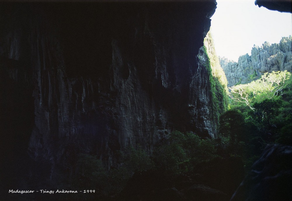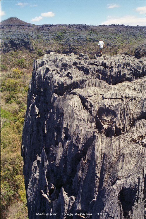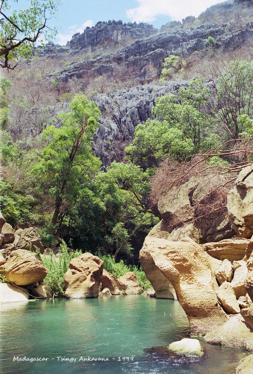 Bonjour, Une petite participation de 1999 (scans de négatifs), avec le Tsingy de l'Ankarana, Madagascar, déjà illustré plus tôt dans ce beau fil thématique : - du côté du lac vert : - détails des lapiaz hyper affutés ; j'entends encore ce bruit typique quand on marche dessus : - un des (ici immense et à sec) boyaux de circulation de l'eau : - au pied d'une falaise, une résurgence alimentant une rivière : - cette même rivière, entourée de falaises/lapiaz : -