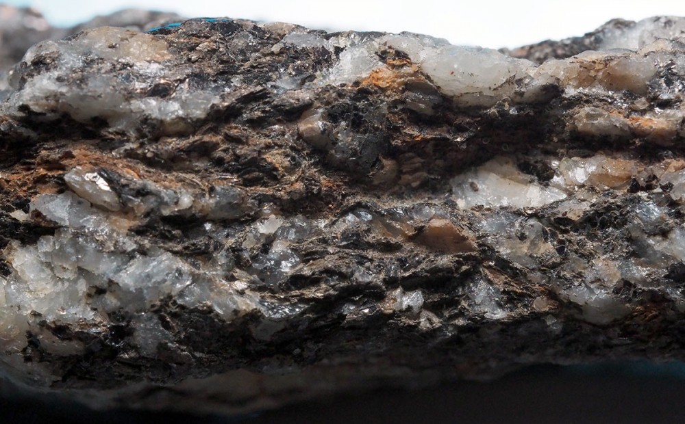 Bonjour à tous, Il m'est arrivé, dans le temps ou dans des pays étrangers, lors de balades, de ramasser des pierres pour leur attrait. Ensuite, les pierres de provenance de pays étranger, je les donnais et, les autres, je les entreposais dans une boite métallique, malheureusement sans autres informations, ni étiquettes, ni annotations, ... J'ai récupéré cette boite qui a dormi pendant deux à trois dizaines d'années dans un sous sol. Je n'ai plus la mémoire des sites ... Voici une roche pour laquelle il me semblerait bien voir du mica noir (biotite ?) en grande quantité et un cristal blanchâtre "amorphe" qui présente des traces d'oxydation (?) par endroits, de couleur rouille plus ou moins intense. J'hésite entre du quartz et du feldspath ... Il raye le verre => Quartz ? Et en voici un grossissement : Est-ce que cette pierre peut être classée comme roche magmatique et comme granite ? Sur la tranche la plus épaisse de cette petite roche, il me semble percevoir des axes plus ou moins droits et parallèles, comme une amorce de feuilletage dont les feuillets sont cependant bien soudés les uns aux autres : Est-ce moi qui affabule ou bien cela pourrait-il être consécutif à l'exercice d'une pression ? Est-ce alors un début de métamorphisme ? Ou bien le caillou est-il simplement magmatique ? Je serais bien intéressé par la lecture que vous pourriez faire de cette roche. Merci par avance, Patrick