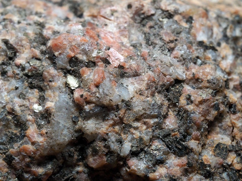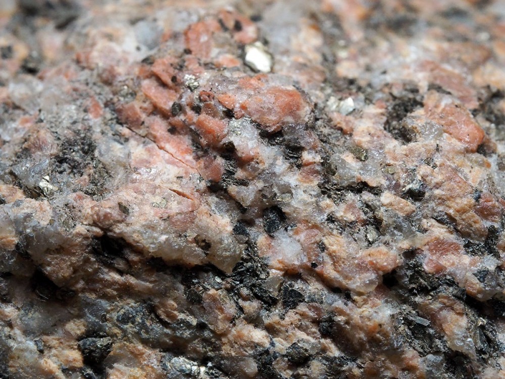 Bonjour à tous, Dans ma boite à cailloux, j'ai une autre petite roche à grains un peu plus fins que la précédente et sans foliation a priori ... J'y vois des cristaux rose saumon et rose pâle (feldspath ?), noir (biotite ?), blanc opaque (quartz ?) et de la couleur du laiton ! Est-ce du granite ? Est-ce du granite rose de la côte du même nom, en BZH ? Sauriez-vous ce que sont ces rares cristaux couleur laiton ? Merci par avance, Patrick
