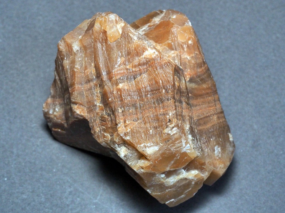 Bonjour à tous, Toujours dans ma "boite à cailloux", j'ai ce bloc (malheureusement abimé), de couleur caramel orangé et de dimensions 62x54 mm ; j'ai procédé à deux tests : dureté : rayé par une lame de bistouri et ne raye pas le verre ; vinaigre : bulles (sous loupe). J'en déduis qu'il pourrait s'agir de calcite et peut-être même, au vu de la forme cristallisée, de calcédoine ? On aperçoit bien sur la 1ère image des strates de couleurs différentes : est-ce un indice sur le processus qui a conduit à sa formation ? (coulée d'eau chargée en calcaire, ou pas, ou autre processus ...) Sur la 2nde image, à peu près au milieu, on aperçoit des plis parallèles au sens du "clivage" (les facettes lisses) : est-ce dû à la pression exercée sur ce bloc ou plutôt à la croissance des cristaux ? ou autre encore ? Merci par avance, Patrick