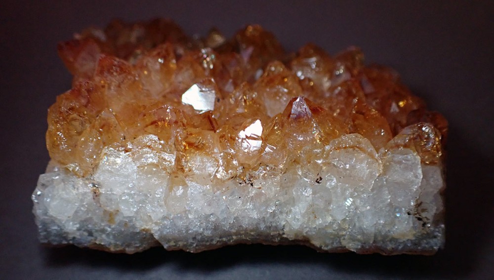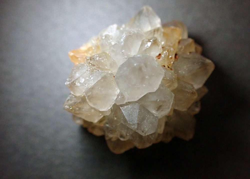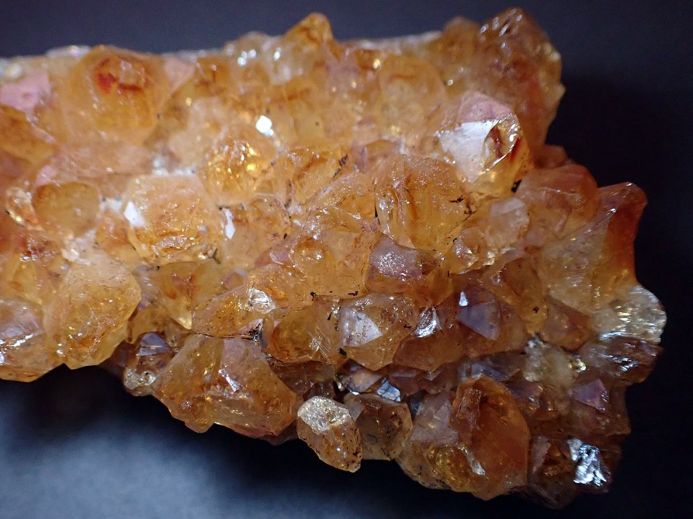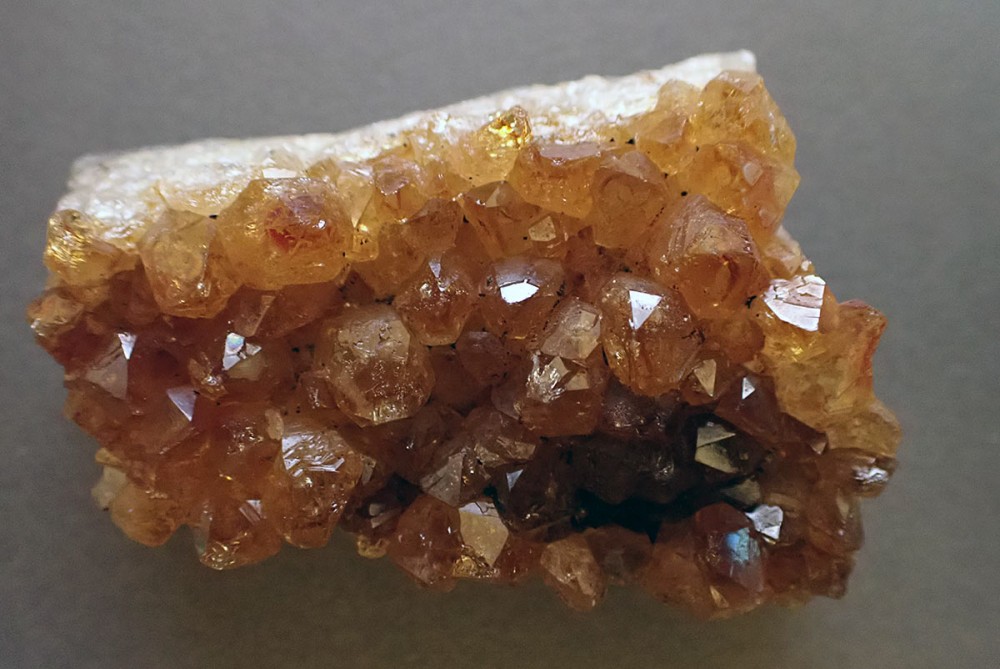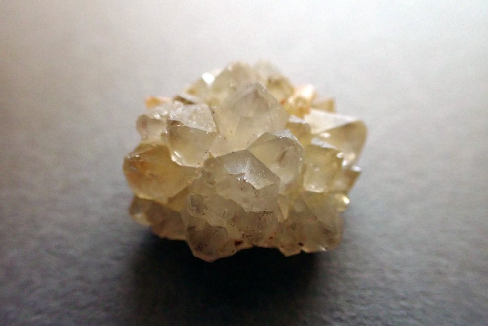 Voici le dernier petit "bloc" portant des cristaux : Fluorine de La Barre (63), France : Le plus gros cristal fait 9,3 x 6,2 mm pour une hauteur approximative de 5,5 mm. Je trouve cette vue intéressante car elle montre des couches ou plutôt une sorte de pierre de couleur variant de crème à miel, fourrée de "cristaux" dans quelques interstices ... sont-ce les mêmes (fluorine) que ceux s'exprimant à la surface ? Je n'en ai aucune idée ... On continue la balade parmi ces cristaux de fluorine quasi transparents, sous une lumière naturelle : -