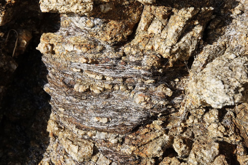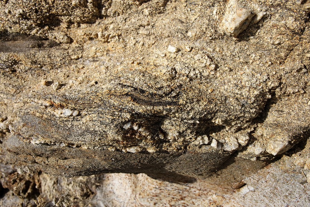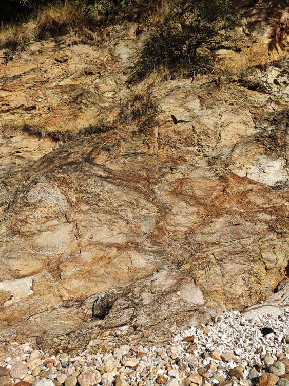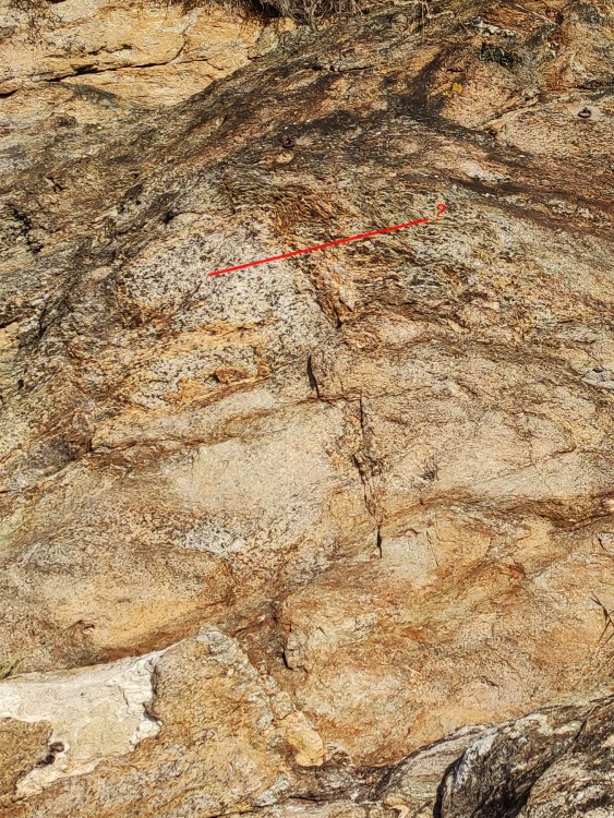 Tout grand merci ! Je crois malheureusement que je n'ai pas grand chose d'autre ... peut-être un détail du secteur adjacent aux leucosomes, laissant apparaître une couche de cristaux de quartz (si je lis bien vos commentaires) qui se désolidarisent plutôt facilement ... Je regarde ce soir. J'ai deux images chacune avec un zoom prise vraiment non loin du granite fin à grenats pustuleux : Hélas, je n'ai pas illustré plus avant la portion de falaise en question ... ... En revanche, j'ai une autre partie située non loin et qui montre un secteur également très tourmenté et dans lequel se trouveraient des grenats ... cf. extrait plus détaillé avec flèche rouge ... ? -