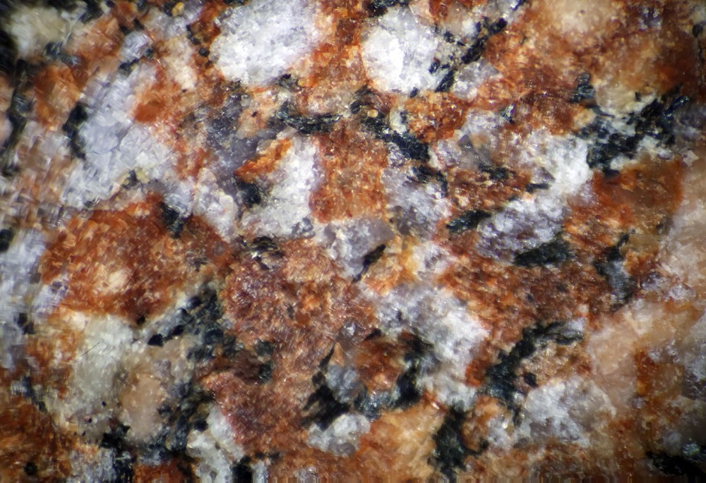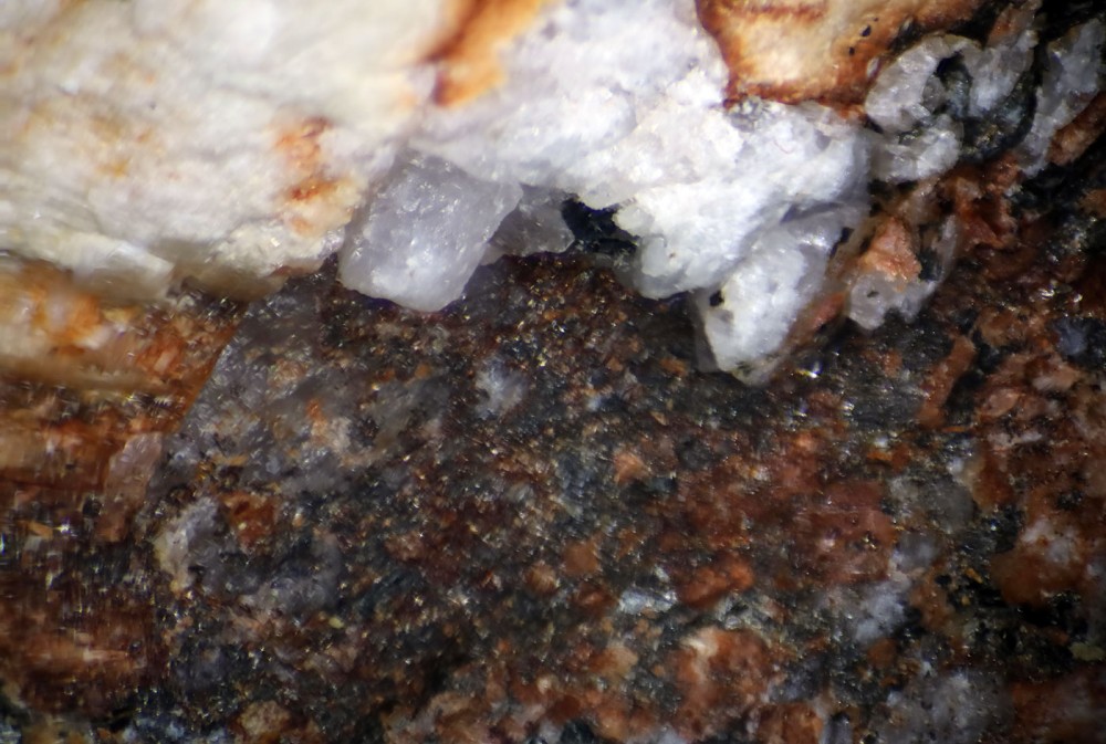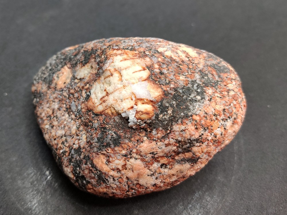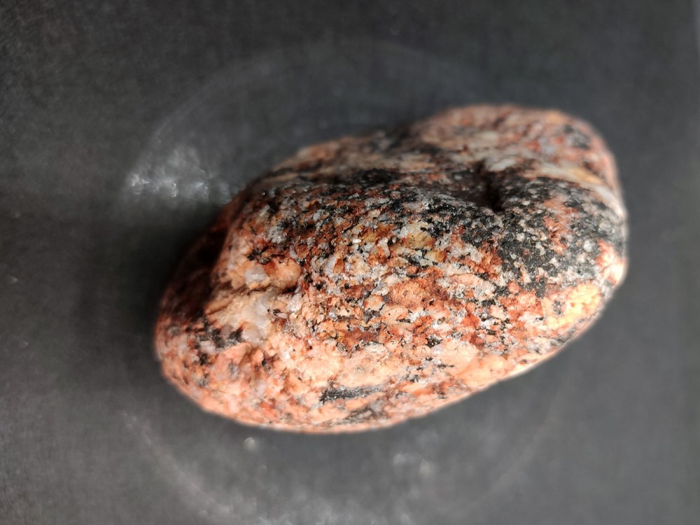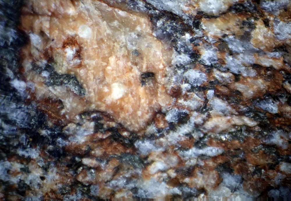 Merci beaucoup !! 😃 De vos regards croisés, je retire du vocabulaire et des lectures parallèles enrichissantes, montrant qu'il y a (souvent ?) un gradient dans les états des roches qui permet de proposer des noms légèrement différents selon ce que l'on retient de l'observation ... Je poursuis cette excursion de lundi dernier, cette fois-ci sur la plage située entre le pied de la falaise du rocher du lion et le rocher de la rougeole ; j'y ai collecté quelques cailloux espérant y trouver des cristaux de grenat ... Je n'avais pas conservé à l'esprit que les roches contenant ces grenats étaient fort dégradées ... et que ce dernier était devenu friable ... bref point de cristaux individualisées je le crains ... J'ai néanmoins trouvé cette roche (cf. ci-dessous) sous forme de caillou de 80 x 60 x 40 mm, contenant divers cristaux dont peut-être ... des grenats ? des feldspaths rose orangé ? un "gros" feldspath blanc jauni veiné de couleur grenat ? Quant aux taches noires ... ? J'avais lu qu'il y avait de la magnétite dans les sables contenant des grenats ... J'ai donc posé un aimant qui n'est pas du tout retenu par la roche ... Donc ? Peut-être de la biotite ? Voici quelques clichés au smartphone et sous binoculaire, à divers grossissements. -