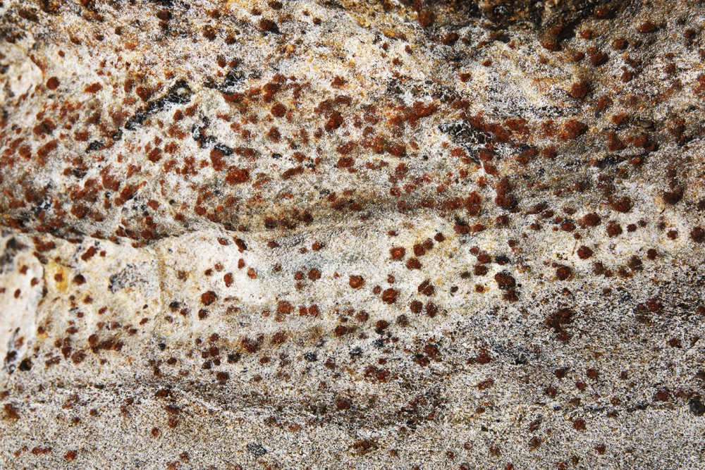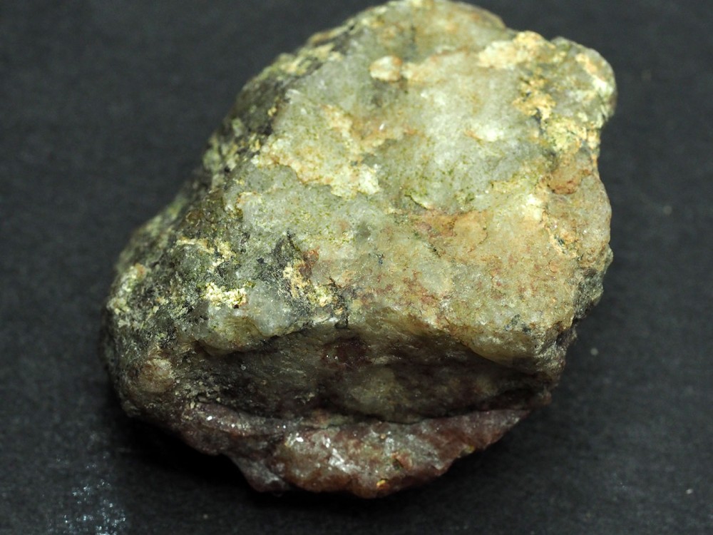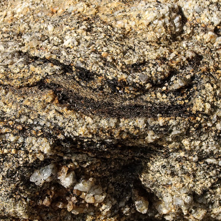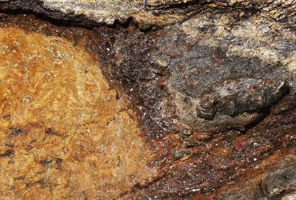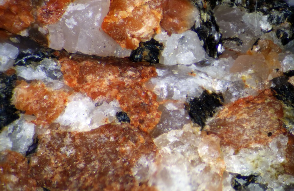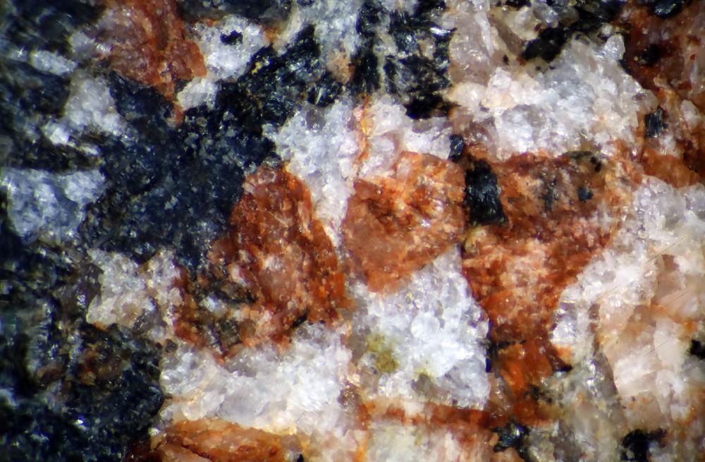 Merci beaucoup !! 😃 De vos regards croisés, je retire du vocabulaire et des lectures parallèles enrichissantes, montrant qu'il y a (souvent ?) un gradient dans les états des roches qui permet de proposer des noms légèrement différents selon ce que l'on retient de l'observation ... Je poursuis cette excursion de lundi dernier, cette fois-ci sur la plage située entre le pied de la falaise du rocher du lion et le rocher de la rougeole ; j'y ai collecté quelques cailloux espérant y trouver des cristaux de grenat ... Je n'avais pas conservé à l'esprit que les roches contenant ces grenats étaient fort dégradées ... et que ce dernier était devenu friable ... bref point de cristaux individualisées je le crains ... J'ai néanmoins trouvé cette roche (cf. ci-dessous) sous forme de caillou de 80 x 60 x 40 mm, contenant divers cristaux dont peut-être ... des grenats ? des feldspaths rose orangé ? un "gros" feldspath blanc jauni veiné de couleur grenat ? Quant aux taches noires ... ? J'avais lu qu'il y avait de la magnétite dans les sables contenant des grenats ... J'ai donc posé un aimant qui n'est pas du tout retenu par la roche ... Donc ? Peut-être de la biotite ? Voici quelques clichés au smartphone et sous binoculaire, à divers grossissements. -