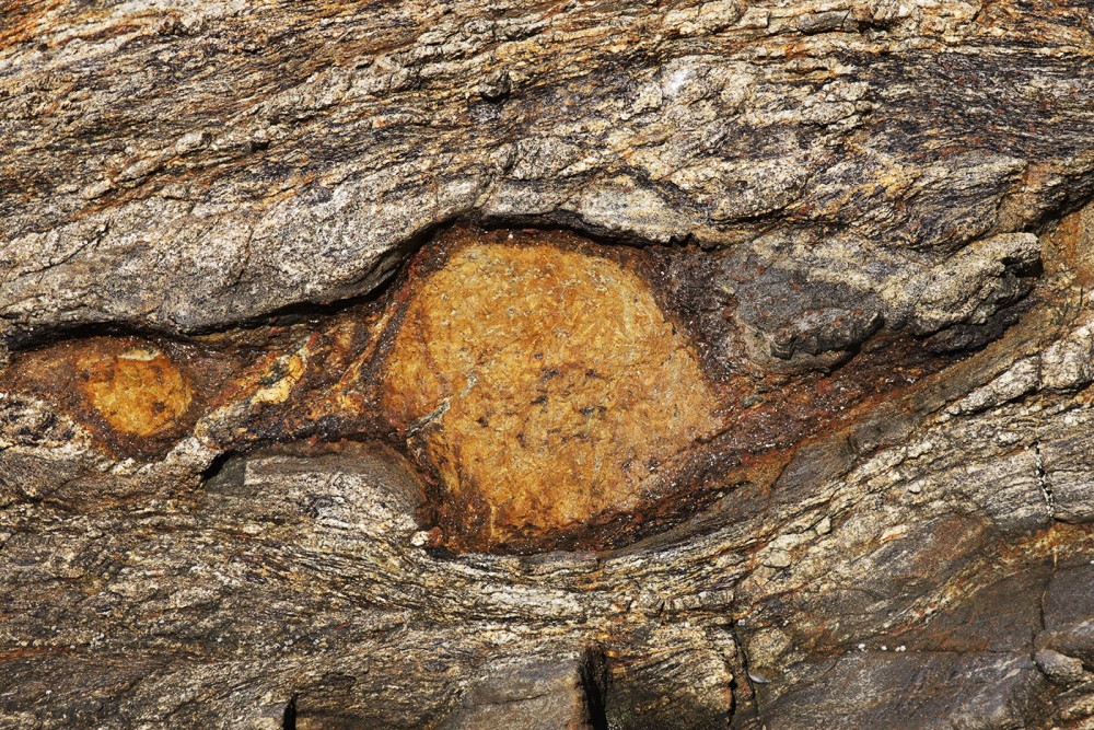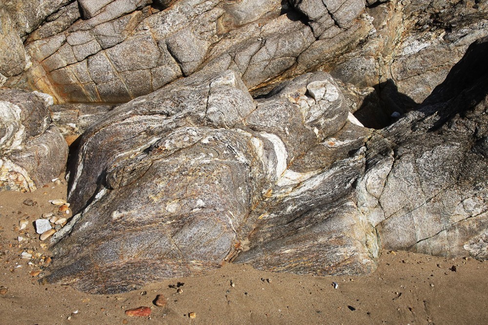 Super ! Merci beaucoup, c'est pédagogique pour moi !! Je me rappelais vaguement de l'expression "gneiss migmatitique" ... mais je n'ai pas osé l'écrire car je ne me rappelais plus de la tournure exacte ... même si je me rappelais un peu de cette notion de gradient existant entre gneiss et migmatite. D'ailleurs quasiment pile en face du rocher de la rougeole, côté terre, au pied des falaises supportant le chemin des douaniers, on trouve cette roche grise et blanche avec de grosses veines blanches (cristaux de feldspaths ?) dans sa partie plissée (partie migmatitique ou simple pression exercée ponctuellement sur du gneiss ?) ... -