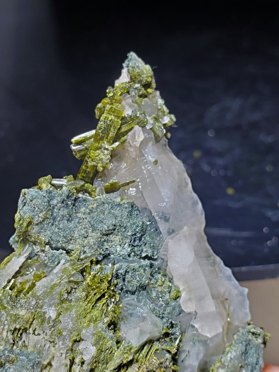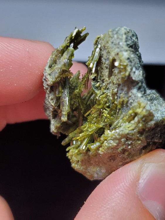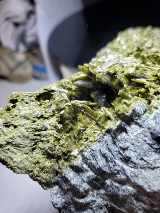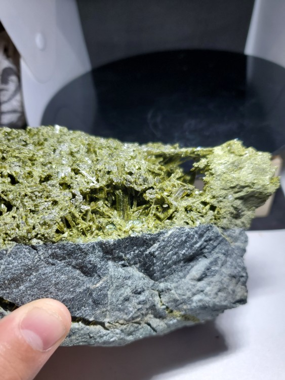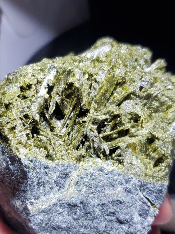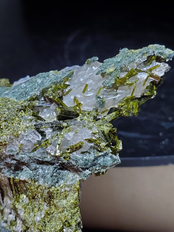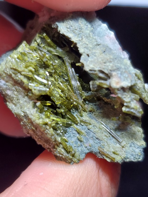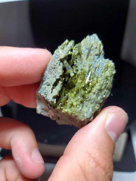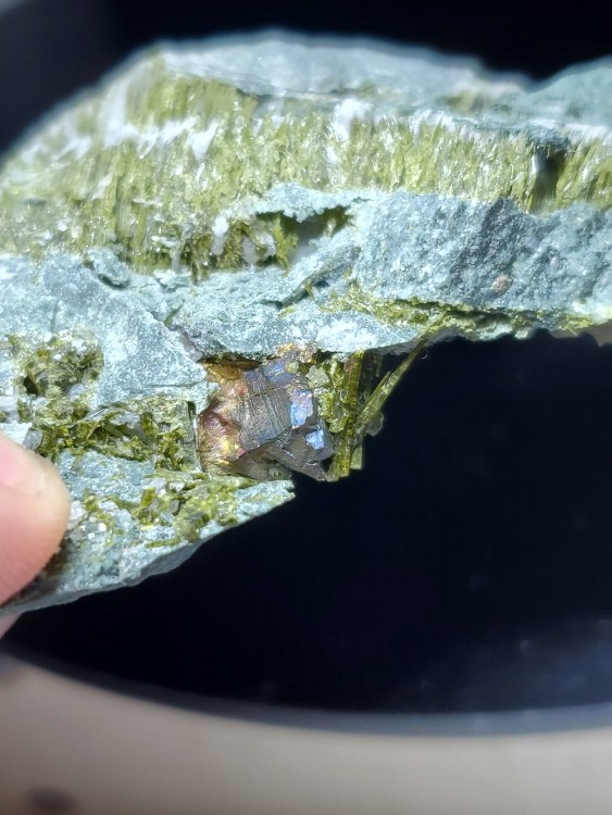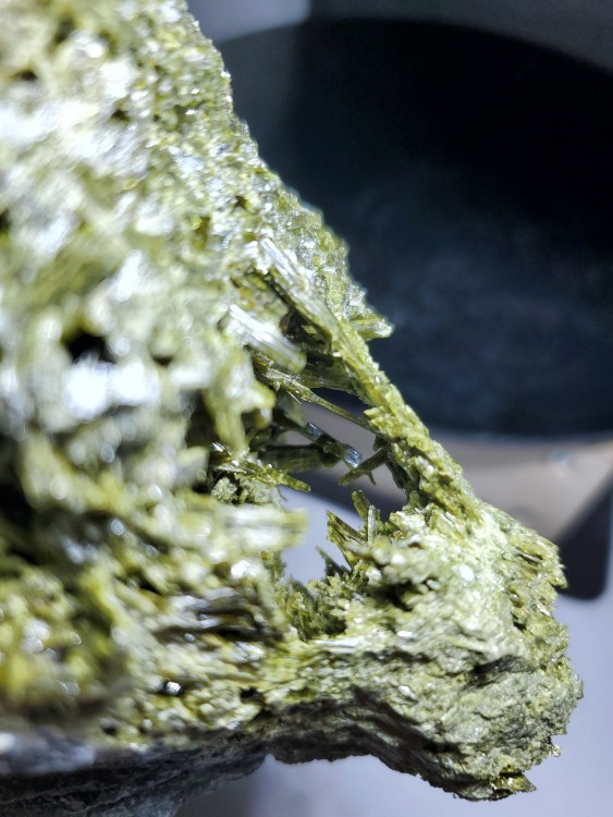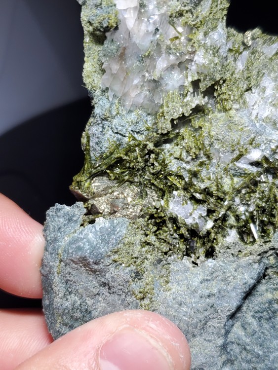 Secteur Pic de Belledonne : Les epidotes étaient pour la plupart prisonnières dans de la calcite, que j ai dissoute. Il y a également des associations avec pyrite et quartz 20250905_224037.mp4