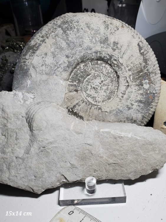 Je me permet de relancer le post avec des trouvailles de février 2025 dans l'Albien de Bellegarde (sauf deux dents de requins qui sont beaucoup plus récentes). À noter que j'ai fais des photos seulement mes plus "belles" pièces, il y a énormément d'autres espèces sur ce site. Je n'ai pas encore identifié toutes les espèces, donc si vous avez des idées, je suis preneur. gastéropode ammonite Ammonite et gryphée Turitelle ? Une autre ammonite nacrage sur un morceau d'ammonite, c'est la premiere fois que je vois ça sur ce site. Dents de requin, d'une zone plus récent (on quitte le crétacé il me semble) Retour à l'Albien avec des dents de requin dont une de 2cm. Voici pour finir une grosse ammonite. On peut noter la présence de petits cubes de pyrite sur cette ammonite. -