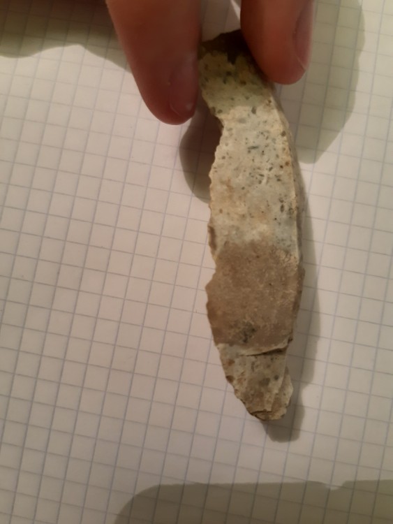 n 5 : il m a fait penser a un percuteur mais bon je reste tout de même sceptique, je pense que c est un simple galet roulé et érodé par la rivière Puis il y a ces deux outils (on va dire n 6 et 7) qui n'ont pas étés trouvés sur le lieu de taille possible au bord de la rivière mais toujours à ojcow ils étaient tout deux posés à demi enfoncé dans le sol l un a côté de l autre. n 6: -