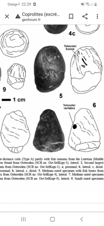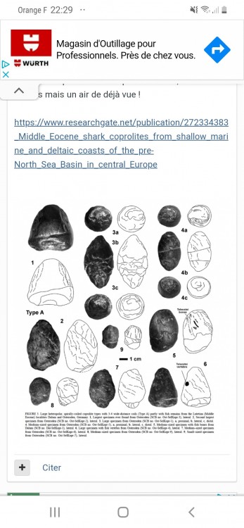 Ok merci pour ta réponse, c est parce que en me baladant sur le site j ai vu des coprolithes de requin quasi identiques avec une sorte de trou sur le côté, mais c est vrai que sans stratification précise il est difficile de s avancer sur quoi que ce soit. La photo de ces coprolithes de requin qui m ont fait douter (ils ressemblent pas mal au mien sans en être sur avec une même couleur et celui du bas possède aussi ce trou:teleostei vertebra). -