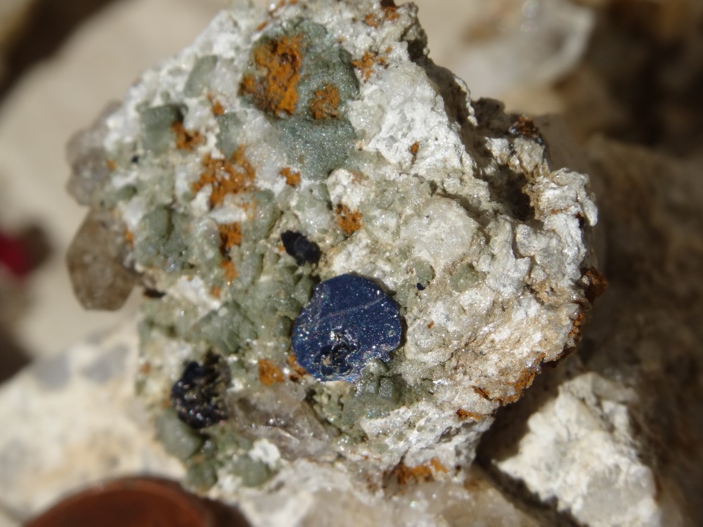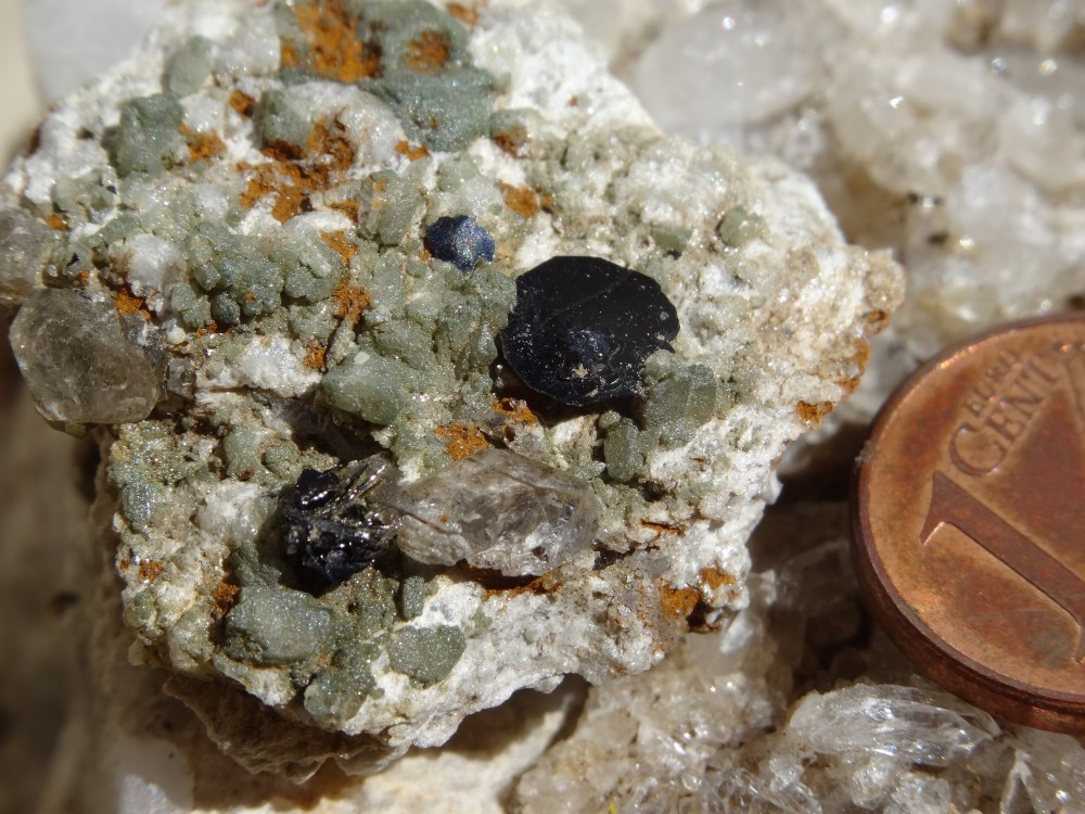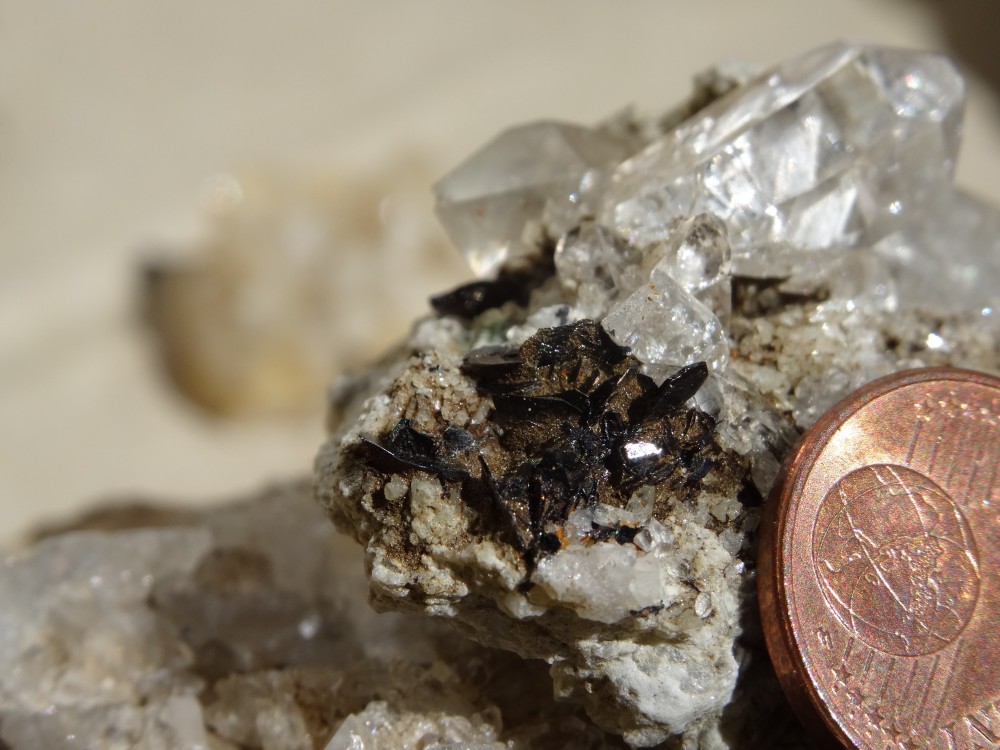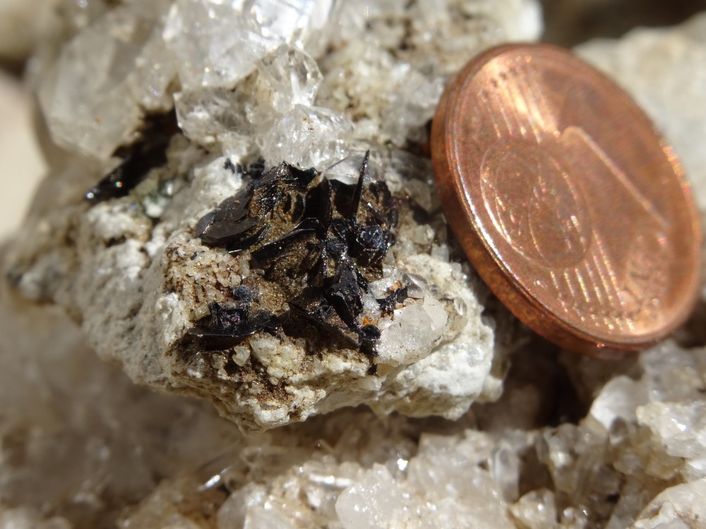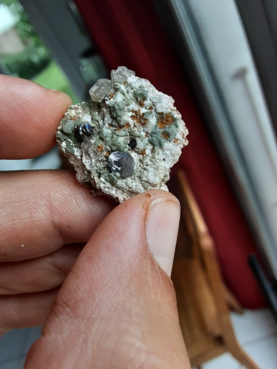 Voici la nouvelle série de photos promises, avec le soleil pour éclairage naturel. J’ai consulté quelques photos sur le site à partir des infos précédentes. J’ai trouvé de fortes similitudes avec mes échantillons dans des commentaires et descriptions, et en même temps des discordances. Par exemple dans la fiche descriptive de l’ilmenite, il est dit que la surface est d’aspect gras et mât alors que sur les photos on voit clairement le côté brillant métallique. La couleur noire bleutée semble aussi différente de la couleur habituelle noire brunâtre.