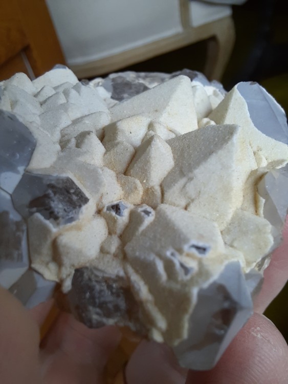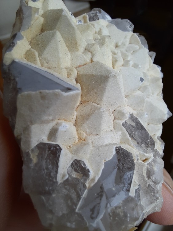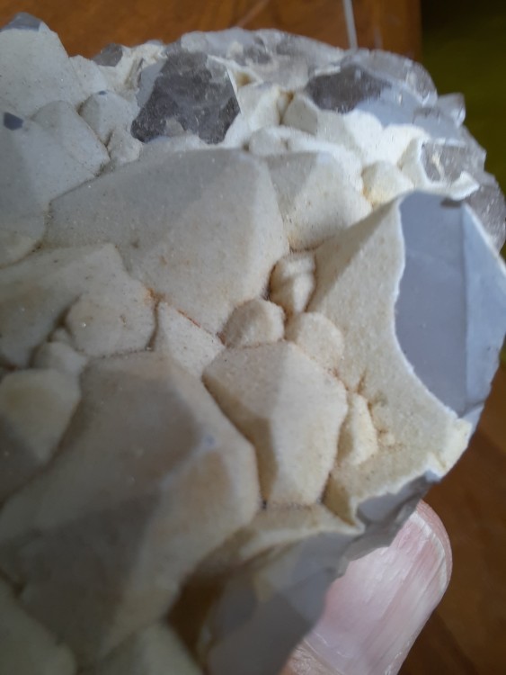 Bonjour au forum, J'ai une pierre sans indications, il y a une couche blanche dessus, on dirait du sable dur. Je me demande si c'est de l'orhose. Des idées sur ce revêtement avec les photos ? Merci par avance. -