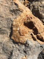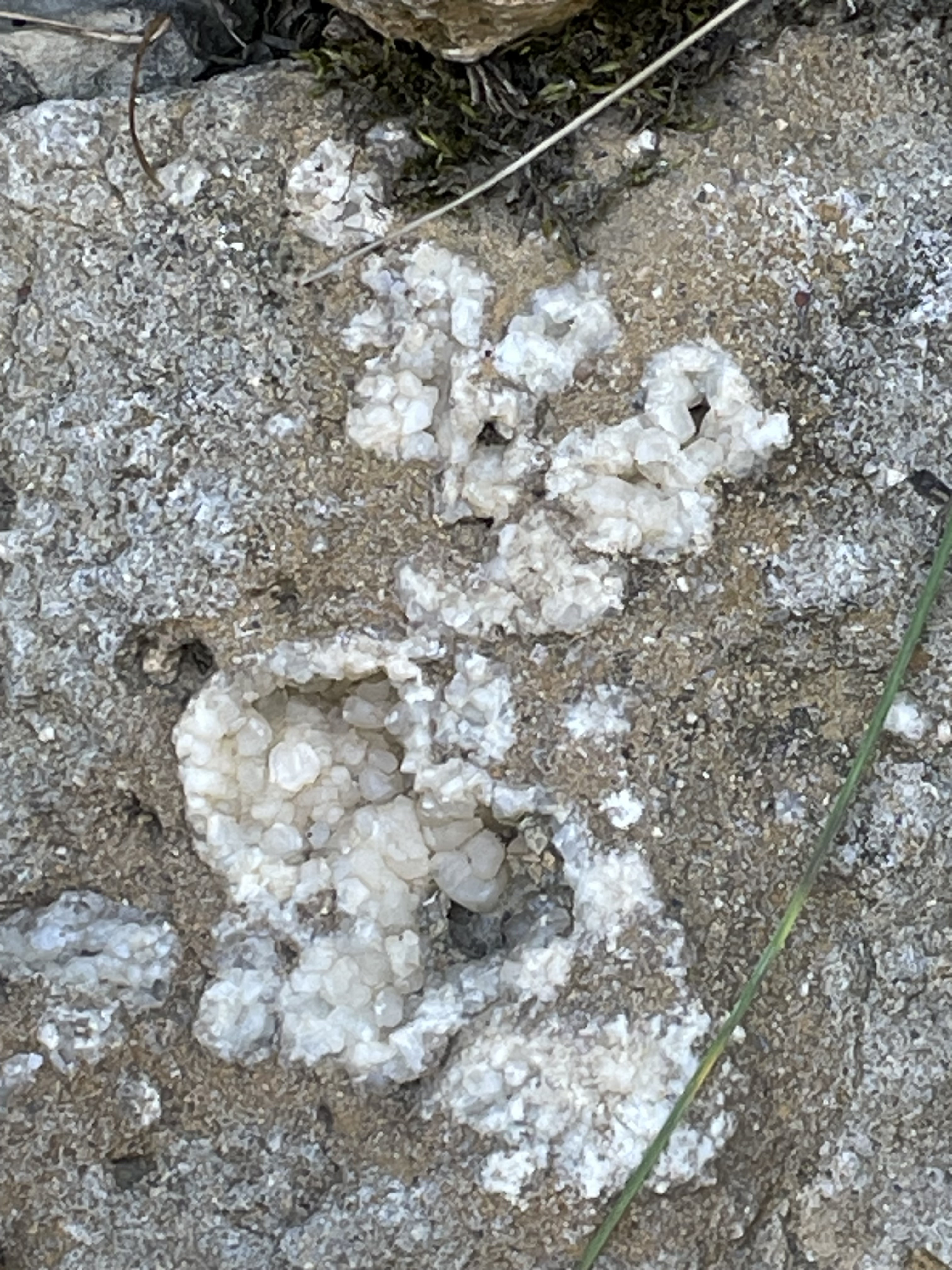 Bonjour a tous, lors d'une sortie sur le Devés j'ai trouvé cette curiosité. j'ai crue as un morceau de gravats avec de la chaux, mais en regardant de plus prêt ..... je suis ouverte a toutes suggestion quand au nom de la cristallisation blanche. taille 4X4 par 3 hauteur . trouvé sur un chemin non remblayer sur le Devés. trace brune pour la roche volcanique, trace blanche pour la matière blanche. pas de réaction au vinaigre. ça change des nodules de peridiotite !! et la dernière photo c'est pour vous montrer comment je triche pour garder mes cailloux dans la maison quand mon mari râle qu'il en trouve dans tout les placard !! -