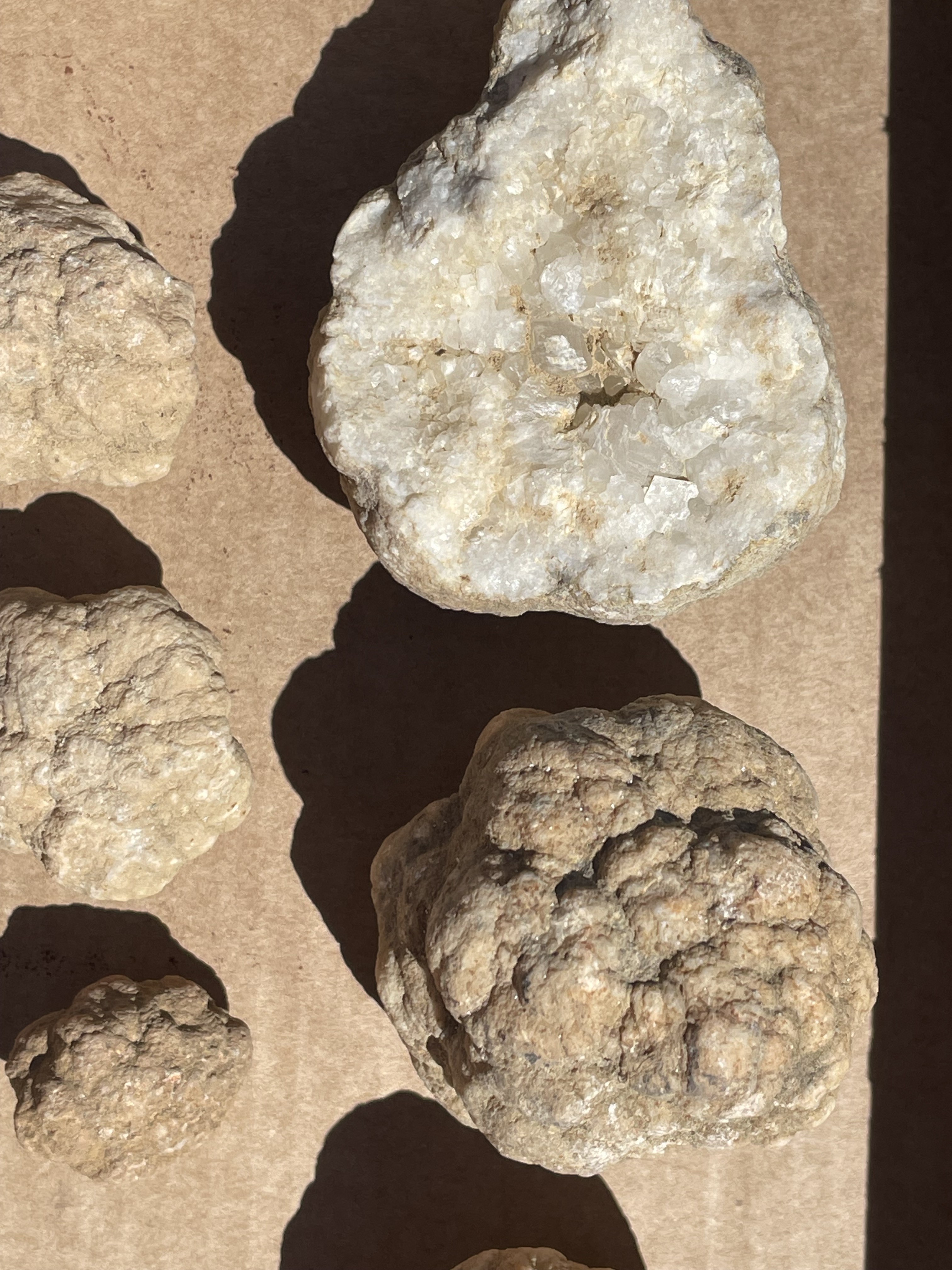 voici quelques clichés supplémentaire 1 géode, 2 vu de la coupe, et oui j'ai essayé de la coupé mais c'est très dense, sûrement pleine. 3 à 9 vu de la bizarrerie 10 et 11 rostre de belemnite, je sais c'est pas des minéraux mais je les ai trouvé dans la même couche. a l'opposer du Mazel. -