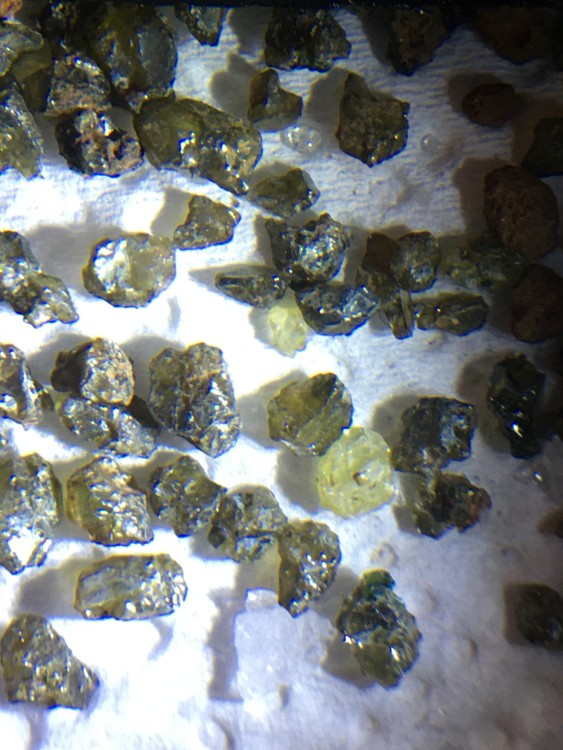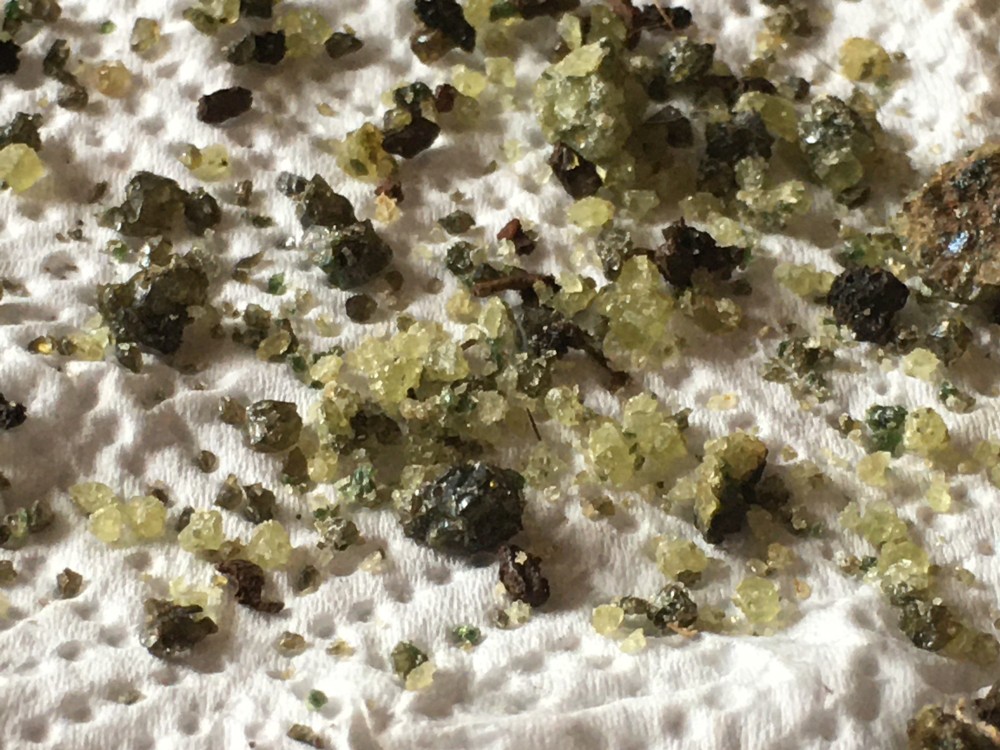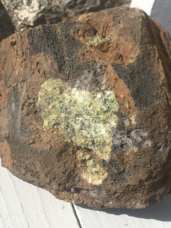 Bonjour a tous, je m'interroge sur la différence de couleurs suite a la découverte de plusieurs nodule de péridotites . je les ai trouvés dans un champ fraichement labourer au sommet d'un maar ? ( je peu employé un mauvais nom ), sur les hauteurs du Puy en Velay vers la chaine du Devés. j'observe 3 mélange bien différant 1) très foncé 2) 60% foncé, 40 % clair 3) 90 % clair, 10% foncé les plus foncé contiendrais t'ils plus de pyroxènes ? les plus clair serais t'il juste de l'altération du a une exposition plus longue a la lumière ? il y en as des bien plus clair avec des cristaux millimétriques vert fluo, je n'arrive pas a identifié ces cristaux. je m'excuse pour ces question de novice. et puis je glisse une photos de bombinette juste parce que c'est la première que je trouve presque intacte. au plaisir de lire vos réponses