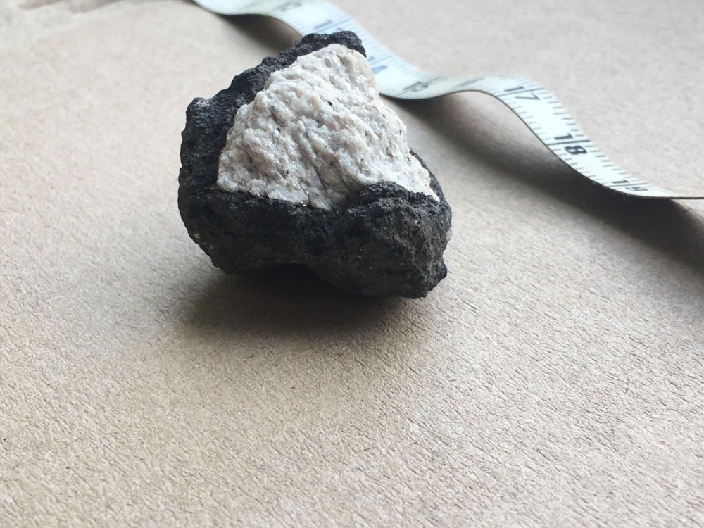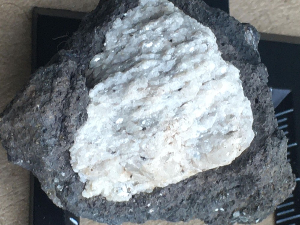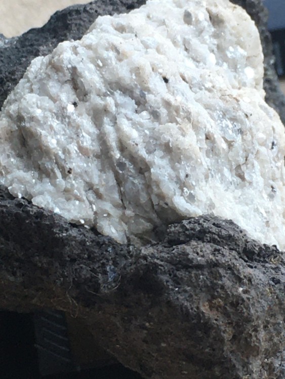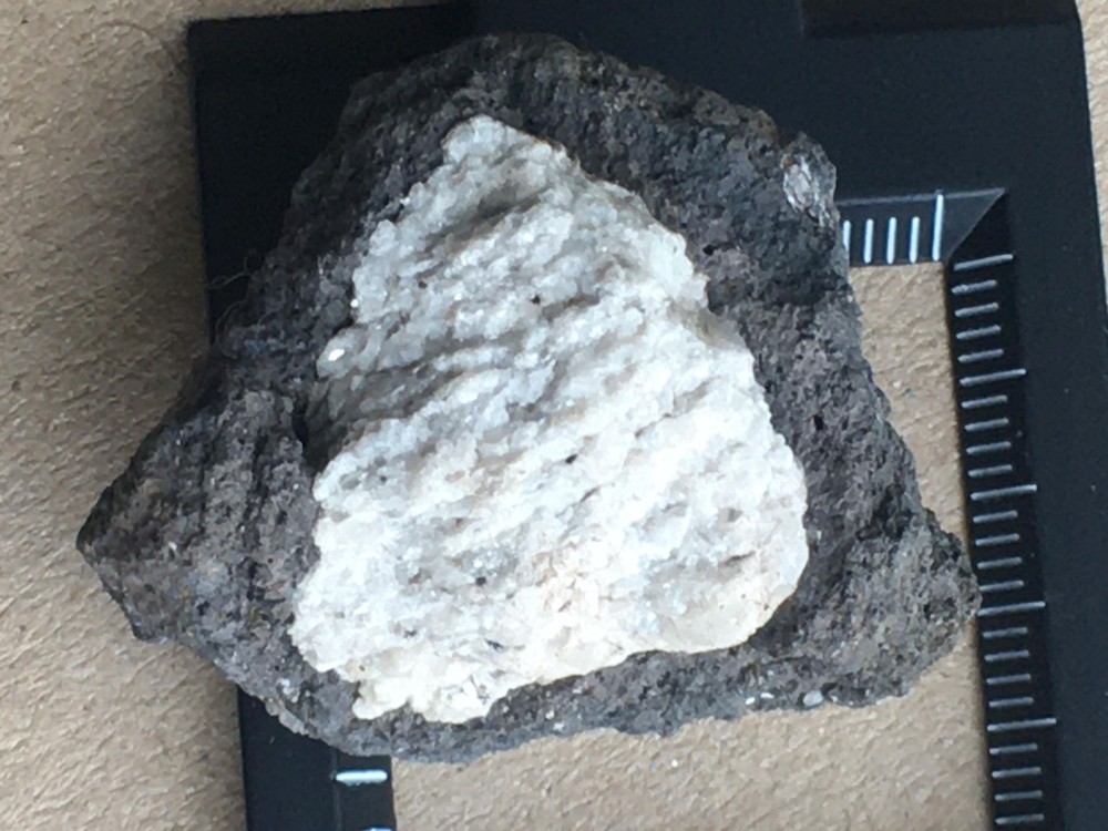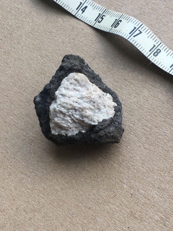 Bonjour a tous, lors d'une sortie sur le Devés j'ai trouvé cette curiosité. j'ai crue as un morceau de gravats avec de la chaux, mais en regardant de plus prêt ..... je suis ouverte a toutes suggestion quand au nom de la cristallisation blanche. taille 4X4 par 3 hauteur . trouvé sur un chemin non remblayer sur le Devés. trace brune pour la roche volcanique, trace blanche pour la matière blanche. pas de réaction au vinaigre. ça change des nodules de peridiotite !! et la dernière photo c'est pour vous montrer comment je triche pour garder mes cailloux dans la maison quand mon mari râle qu'il en trouve dans tout les placard !! -
