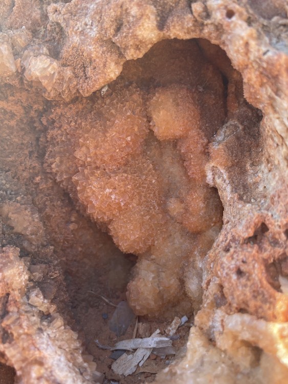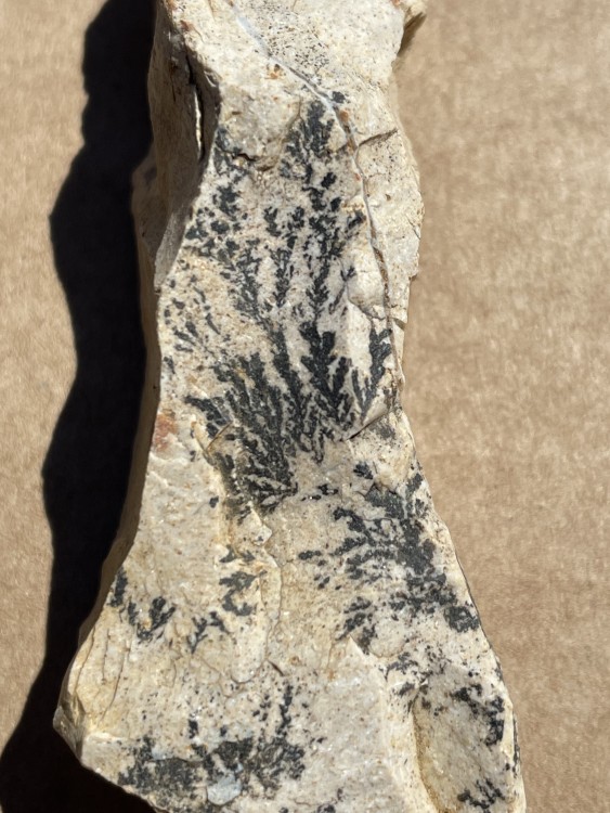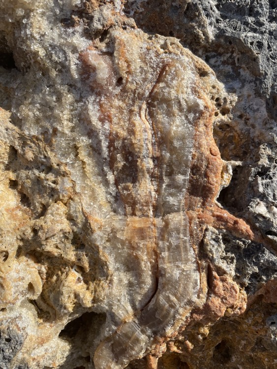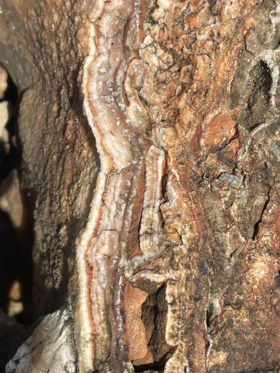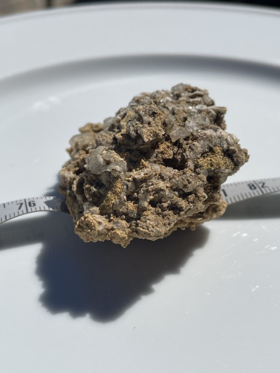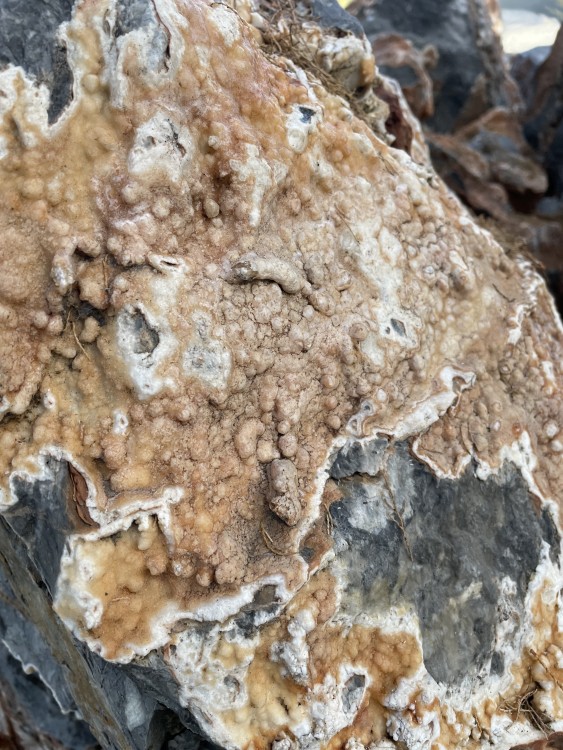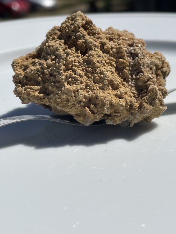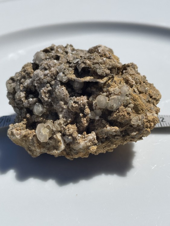 Bonjour a tous, lors d'une sortie sur le Devés j'ai trouvé cette curiosité. j'ai crue as un morceau de gravats avec de la chaux, mais en regardant de plus prêt ..... je suis ouverte a toutes suggestion quand au nom de la cristallisation blanche. taille 4X4 par 3 hauteur . trouvé sur un chemin non remblayer sur le Devés. trace brune pour la roche volcanique, trace blanche pour la matière blanche. pas de réaction au vinaigre. ça change des nodules de peridiotite !! et la dernière photo c'est pour vous montrer comment je triche pour garder mes cailloux dans la maison quand mon mari râle qu'il en trouve dans tout les placard !! -