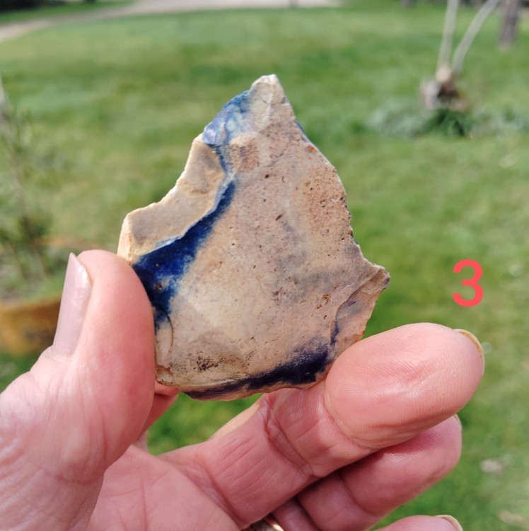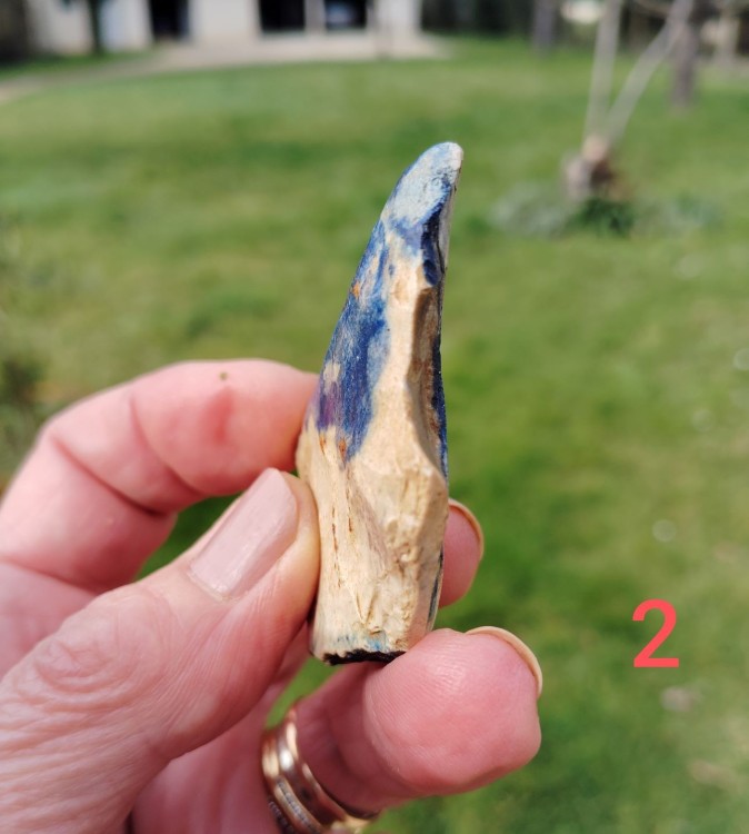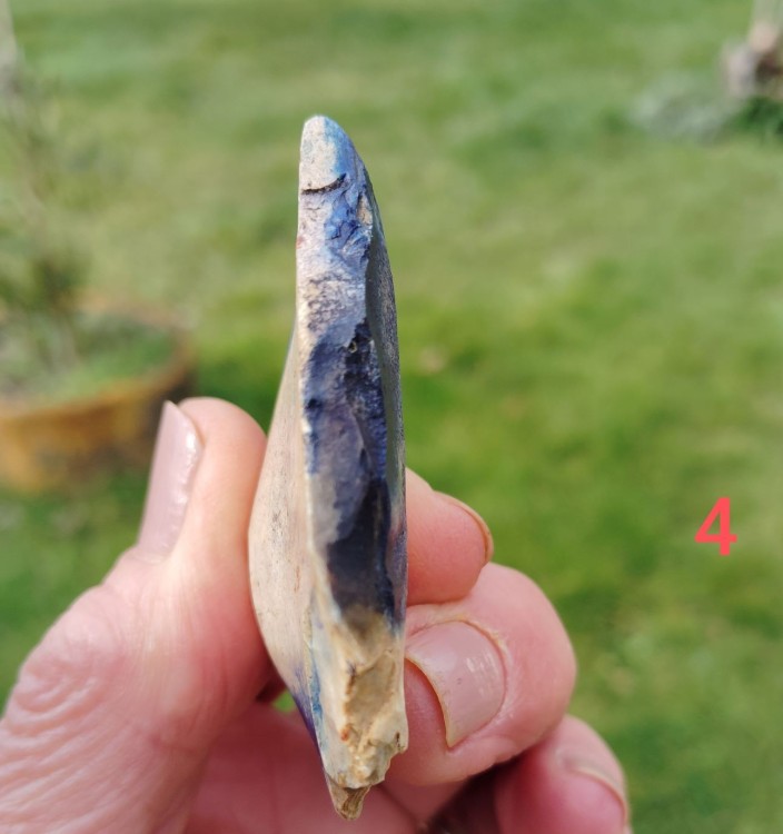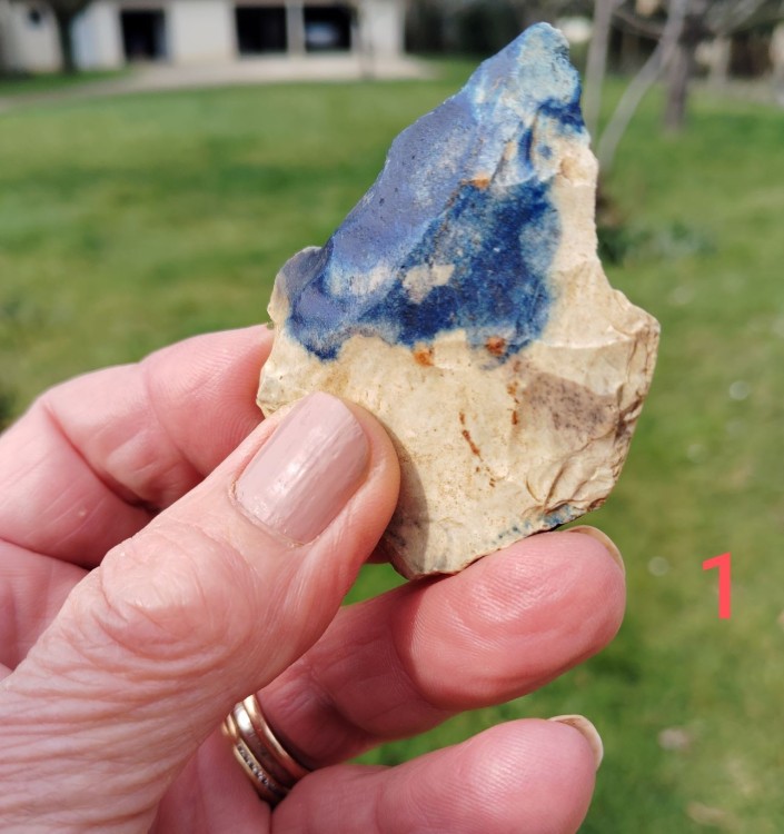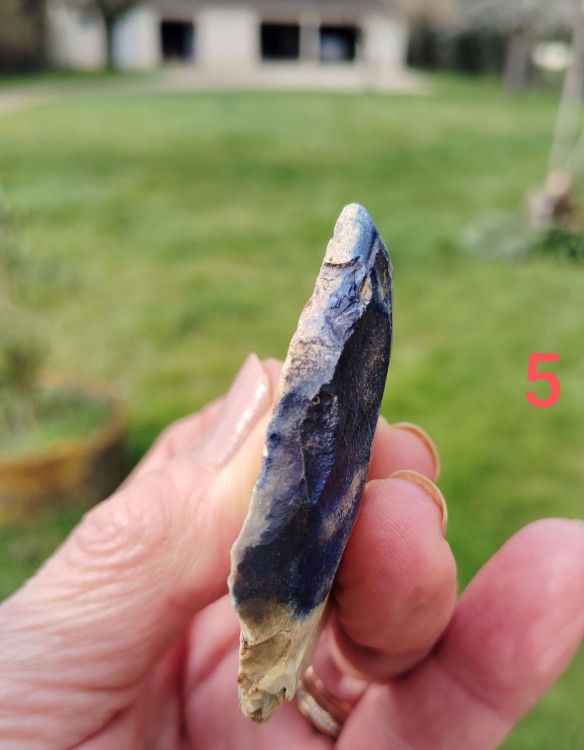Bonsoir à vous tous, j'ai demandé votre avis en 2020 sur ce silex de couleur inhabituelle , c'est vrai, le bleu est bien soutenu , et réel . Dans mon secteur le Périgord noir , il est fréquent de trouver des pièces isolées , silex noir gris, blanc , miel etc .. mais bleu .. jamais , meme au musée de la préhistoire des Eyzies , que j'ai parcouru très souvent , notamment le 1er dimanche de chaque mois ou l'entrée est gratuite 😁, pas de trace de silex bleu ! Gaël avait eu la gentillesse de m'envoyer un super lien sur le cheminement de ce type de Silex depuis le Lot et Garonne, grand merci à lui . Je vais vous faire quelques autres photos sous des angles différents et s'il y a des tests à effectuer , c'est ok .