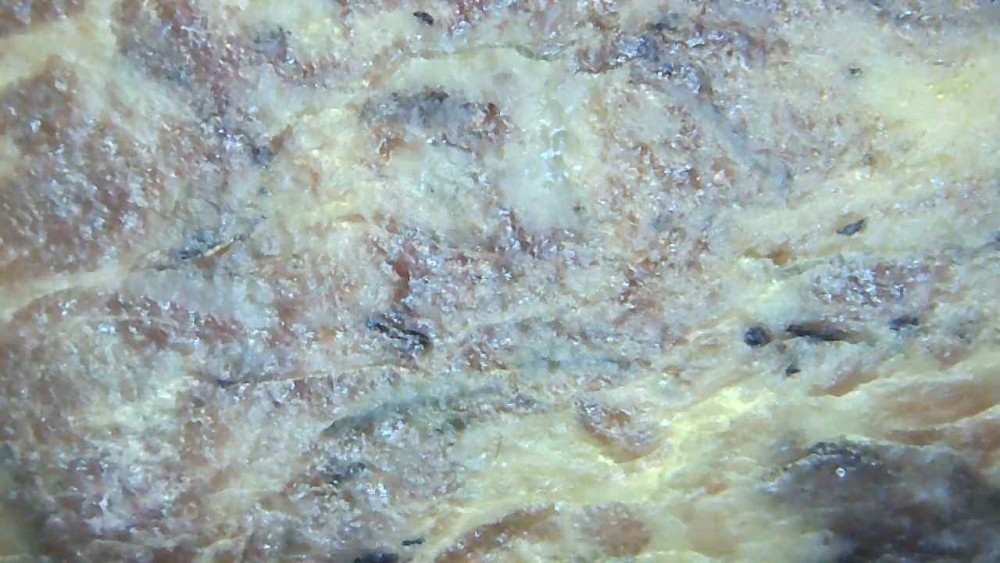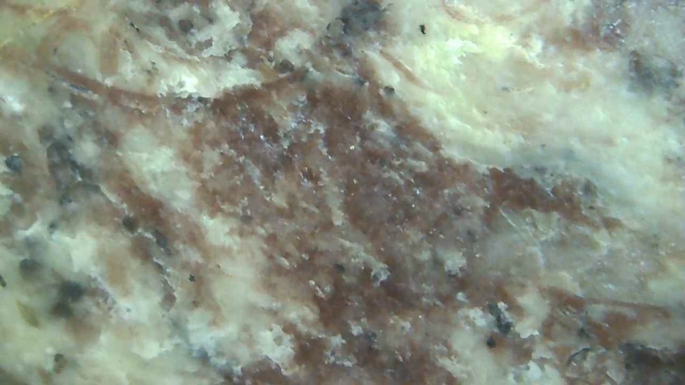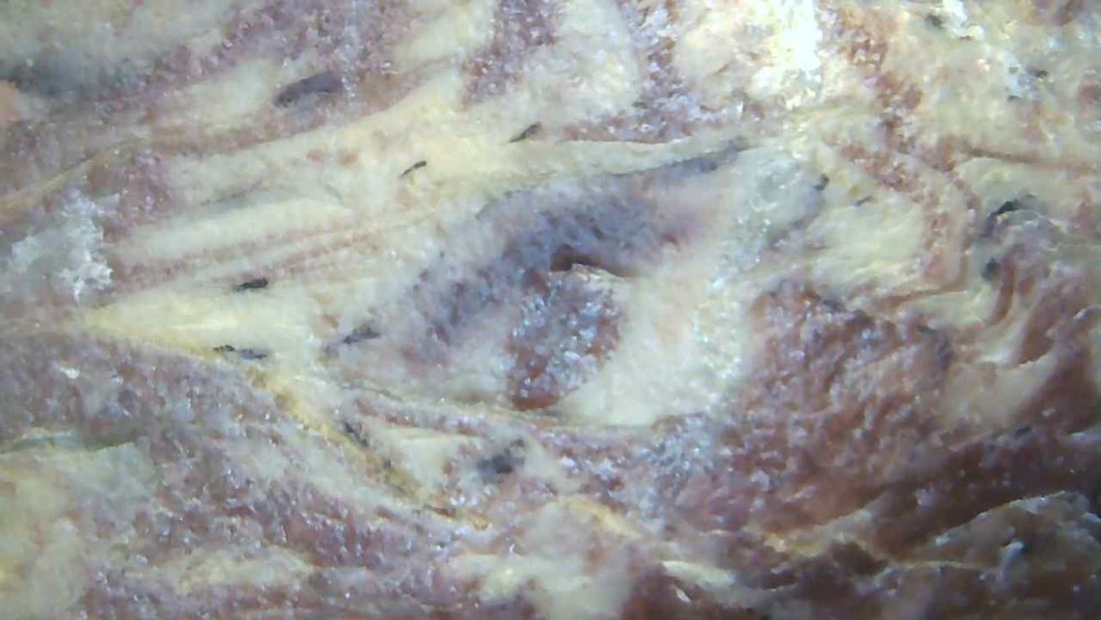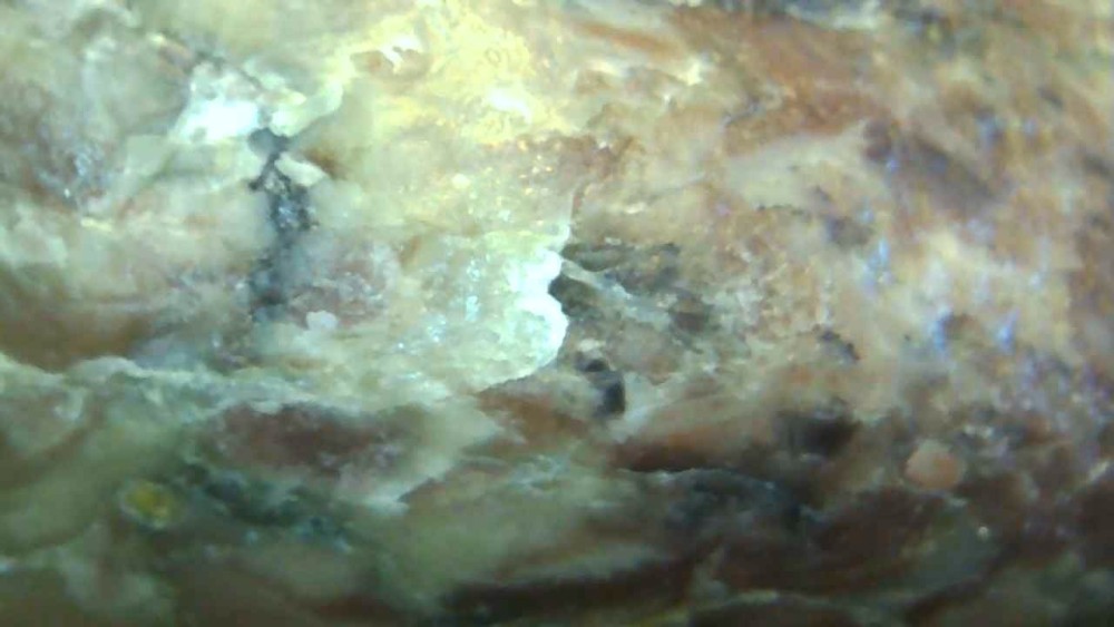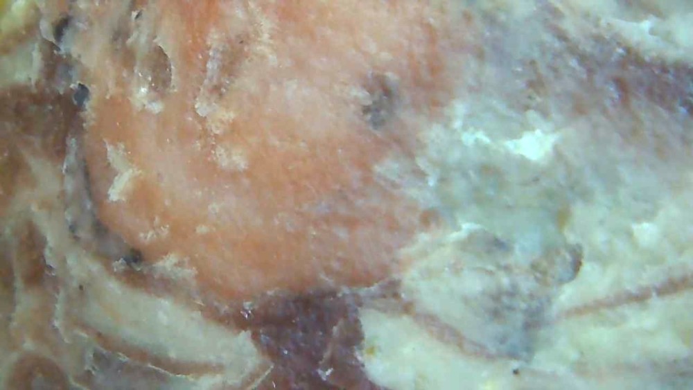 Quelque soit l'endroit où je dépose l'acide, il y a réaction. J'arrive à rayer du verre. Le galet a un aspect gras "luisant", mais les parties mauves brillent beaucoup au soleil. Le galet ne laisse aucune trace de couleur.