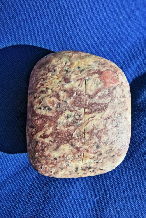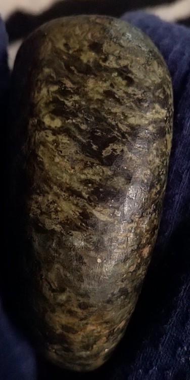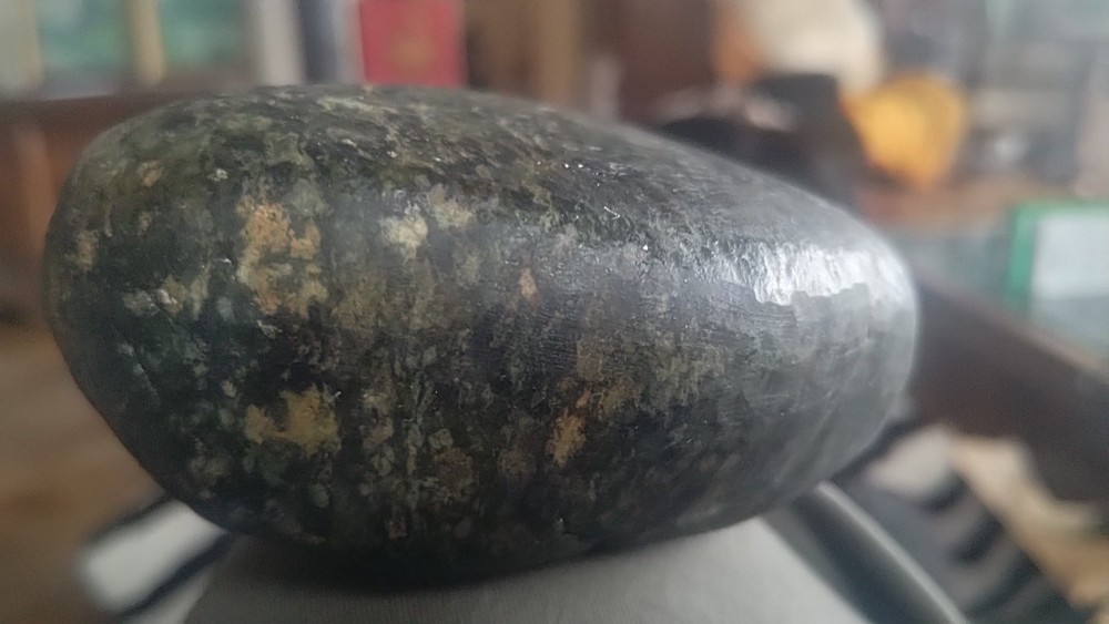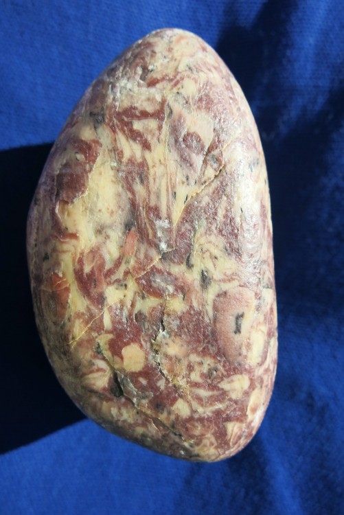 Ce galet vient d'une gravière à proximité du Rhône. En Valais (Suisse), il y a de nombreuses gravières à côté de Rhône, il en résulte des étangs. C'est dans l'un deux que provient ce galet. J'ai l'habite de m'y promener, c'est la première fois que je vois un galet comme celui-ci.