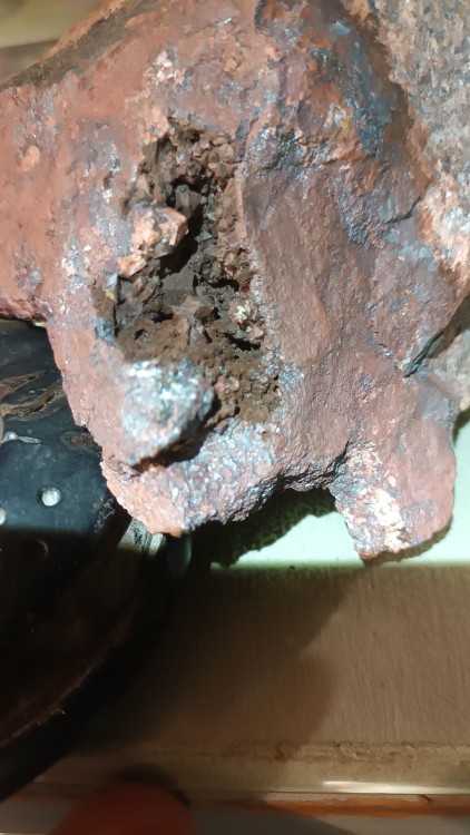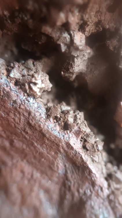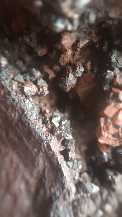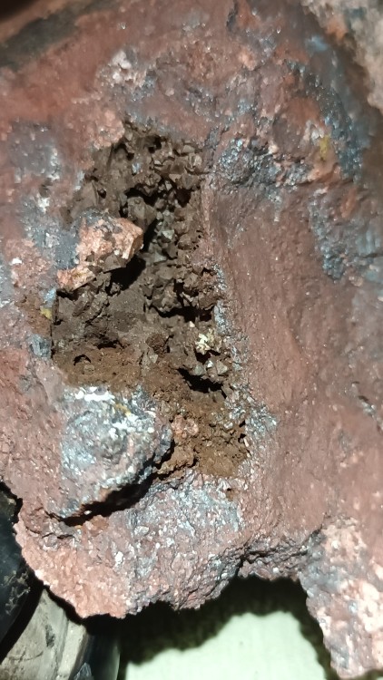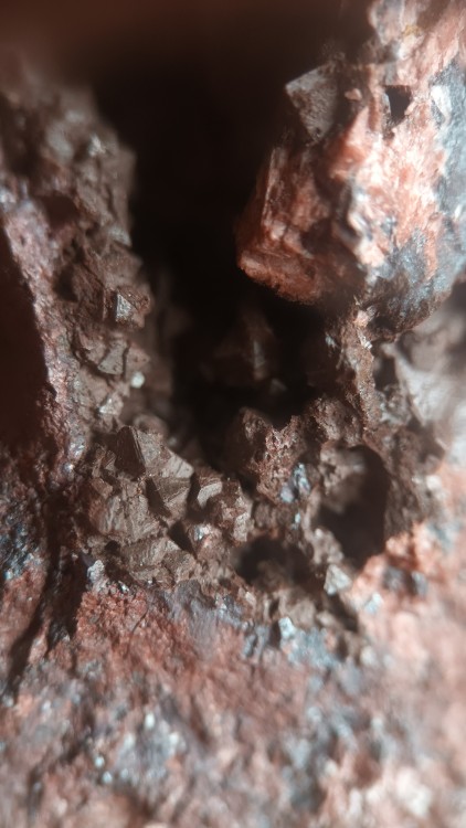 Bonjour, J'ai trouvé près de la Rotlach (Bas-Rhin)une roche semblant être de l'hématite. Pour le contexte zone de contact entre deux granites. Je l'ai brisé et j'ai des cavités avec de petits cristaux pyramidaux. Je n'ai pas trouvé de cristalisation pyramidale pour l'hématite à part de la magnétite qui devient de l'hématite. C'est peut être un autre mineral tel la tétahédrite(bof), pyrite, marcassite...? 1. 2. 3. 4. 5. Je vais faire quelques tests ce soir si besoin et essayer d'enlever le dépôts brun. Qu'en pensez-vous? Goyo