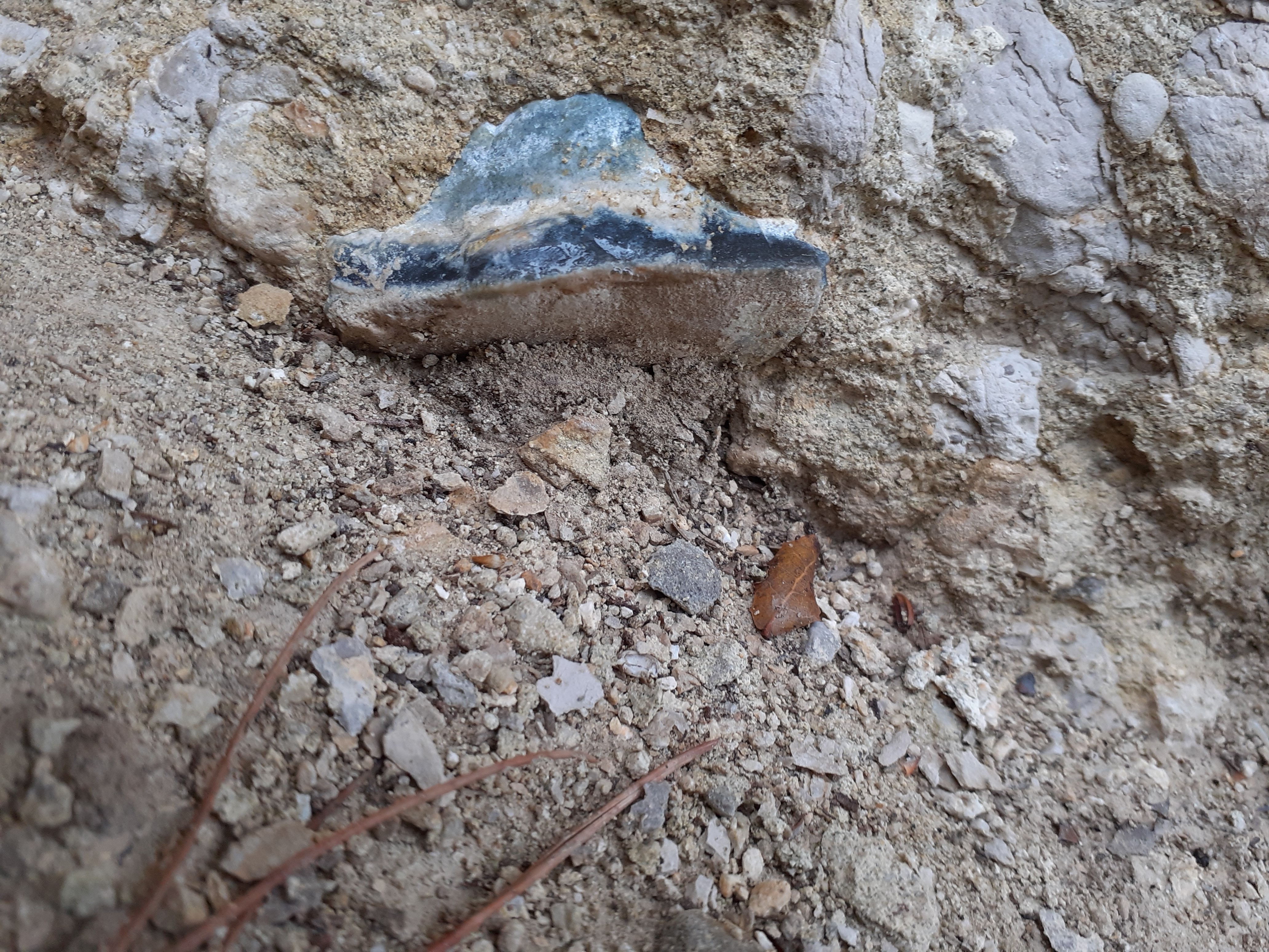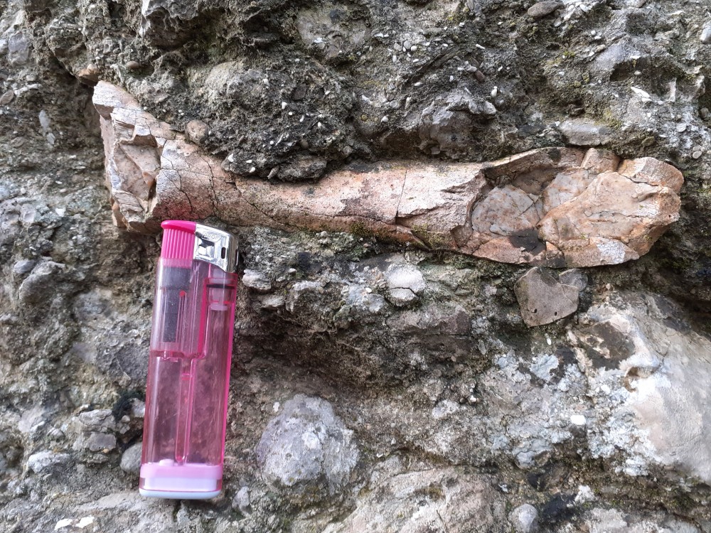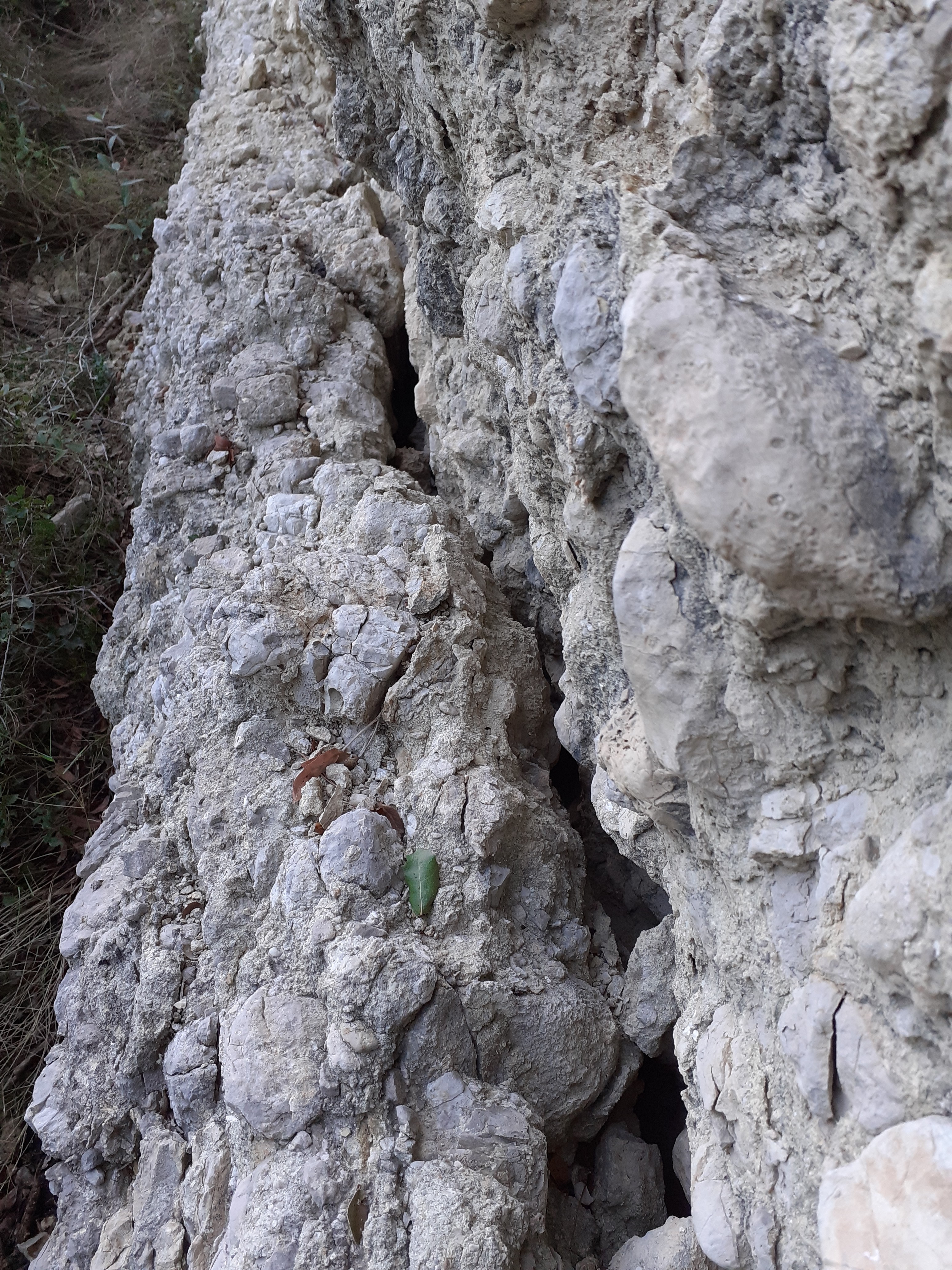 en effet ça fait penser à un ancien lit torrentiel ou une nappe de charriage ou faille ou toutes sortes de choses auraient été bousculé, roulé, emporté, chahuté avec des morceaux de roches de différentes couleurs angulaires d'autres complètement polis certains comme des galets d'autres de taille gravillonnaire , pas mal de silex du marron clair au noir bleuté le tout emprisonné dans un ciment parfois très dur et parfois très friable d'aspect sablonneux.