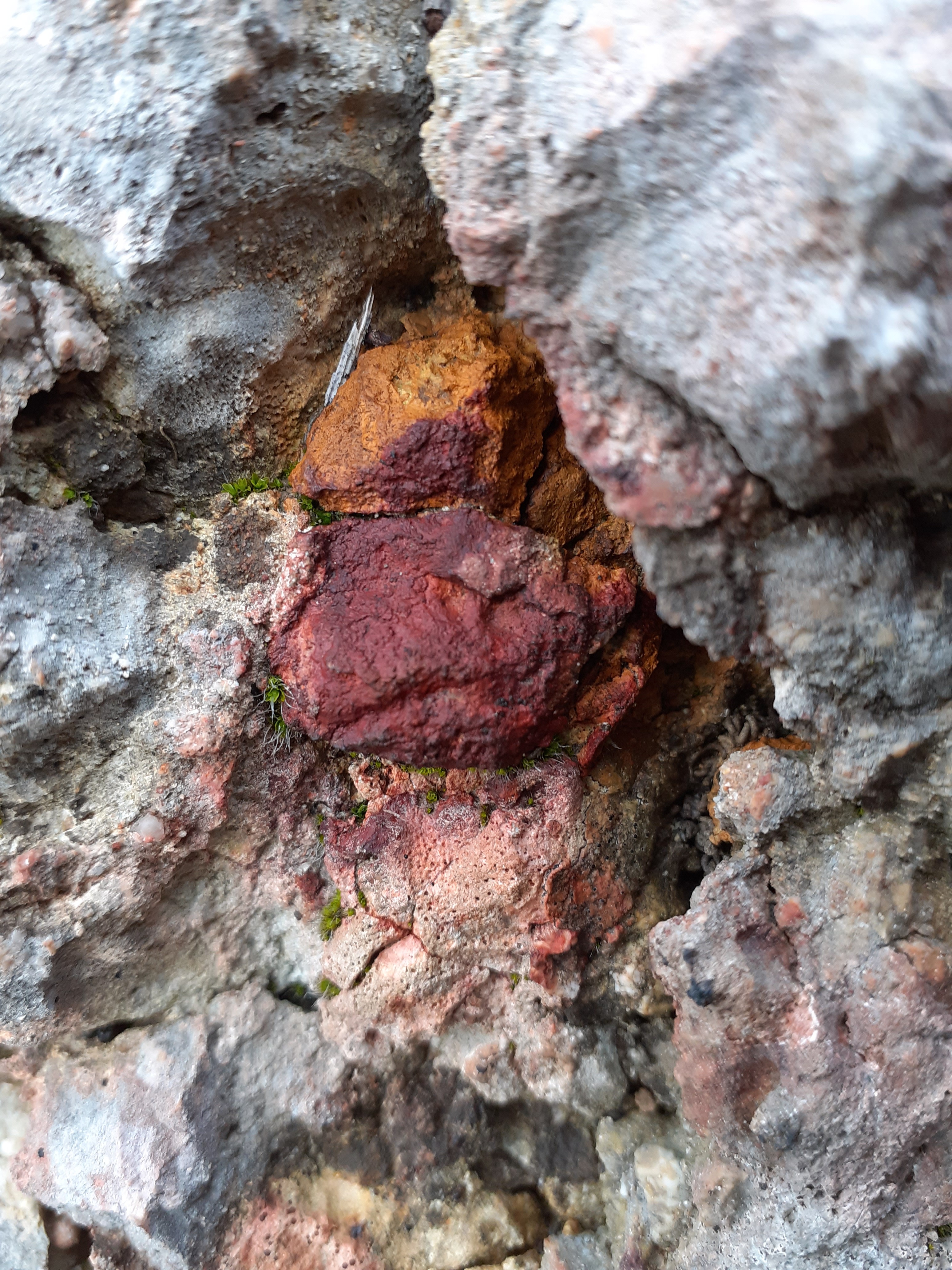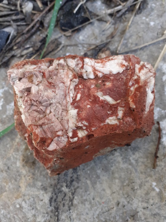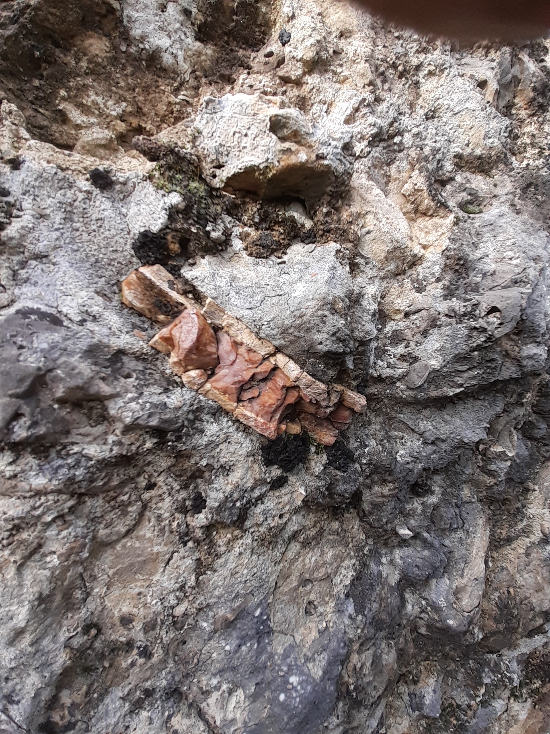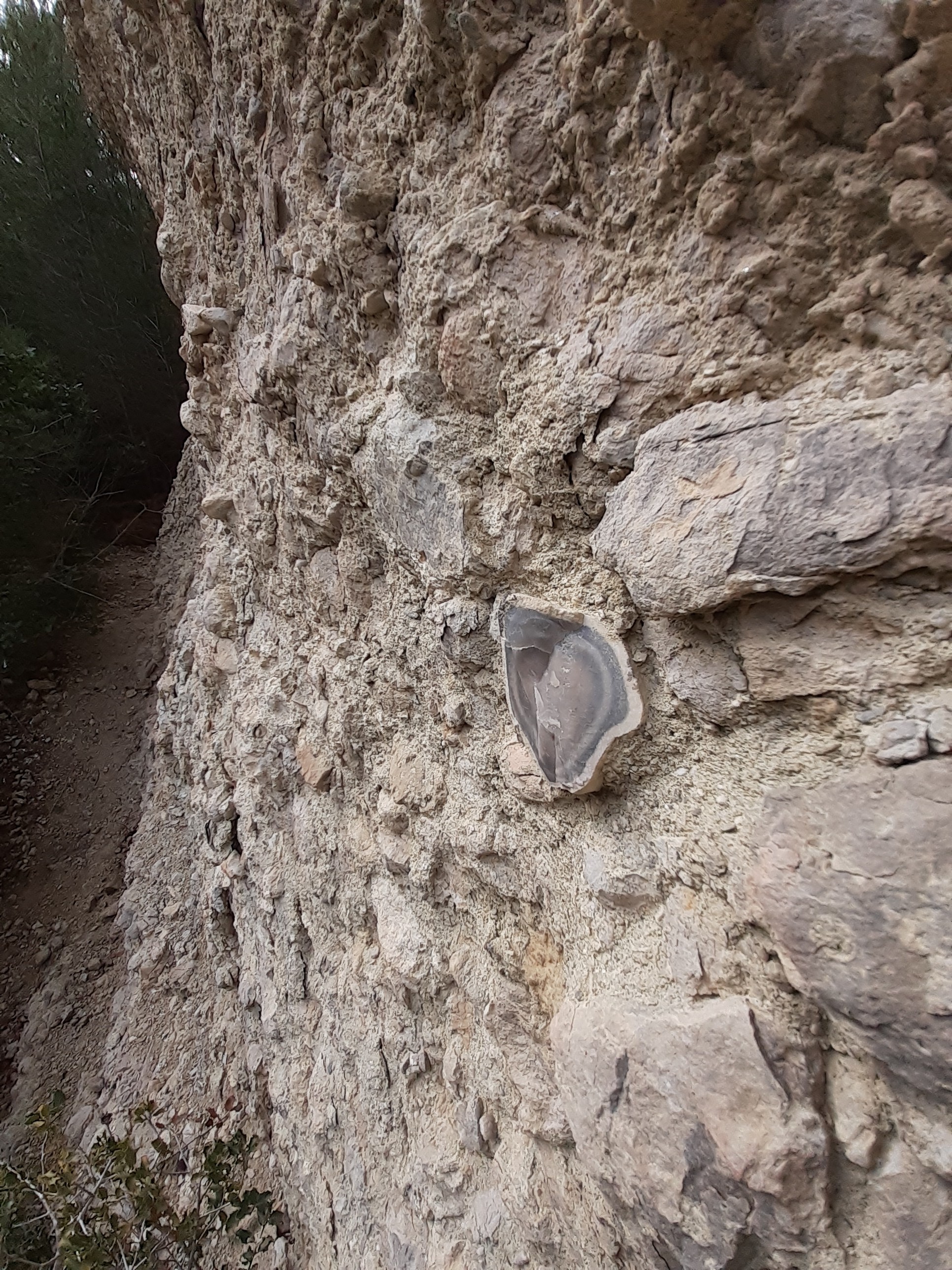 en effet ça fait penser à un ancien lit torrentiel ou une nappe de charriage ou faille ou toutes sortes de choses auraient été bousculé, roulé, emporté, chahuté avec des morceaux de roches de différentes couleurs angulaires d'autres complètement polis certains comme des galets d'autres de taille gravillonnaire , pas mal de silex du marron clair au noir bleuté le tout emprisonné dans un ciment parfois très dur et parfois très friable d'aspect sablonneux.