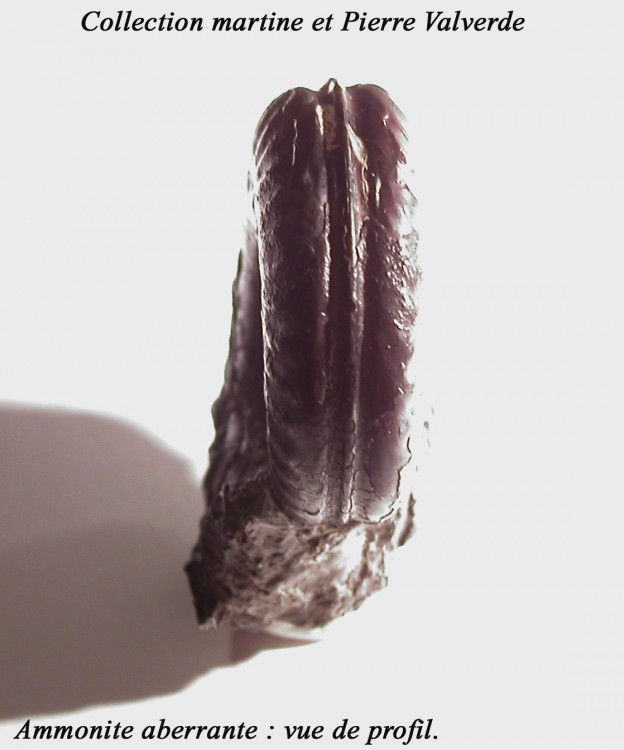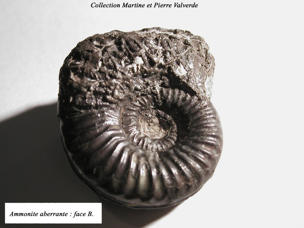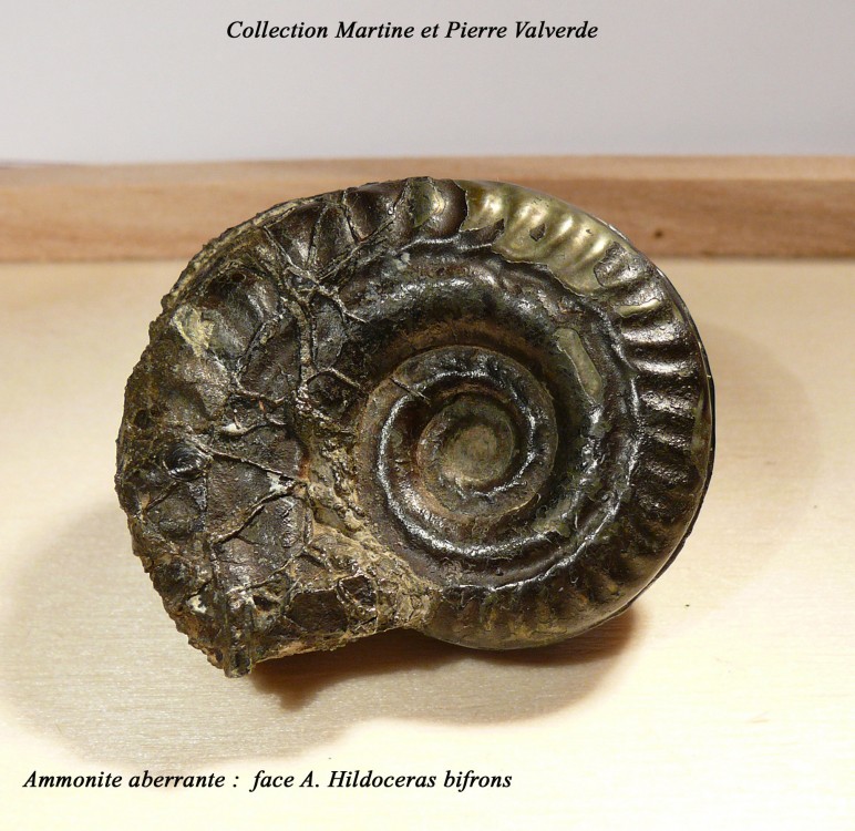 " En fait, nous avons regroupé tous les spécimens d'ammonites asymétriques sur lesquels 2 taxons bien déterminables sont identifiés sur les 2 faces (voir pièce jointe). Dans le cas de votre spécimen, le côté non-Hildo n'a pas pu être associé à un taxon déjà existant, nous supposons donc que ce côté montre plutôt une réponse aberrante de la coquille en réponse à une blessure. Cependant, nous n'avons pas pu identifier la blessure ni comprendre pourquoi votre spécimen a réagi d'une telle manière".