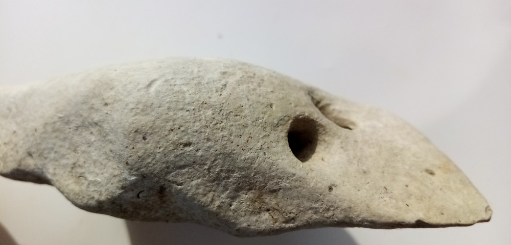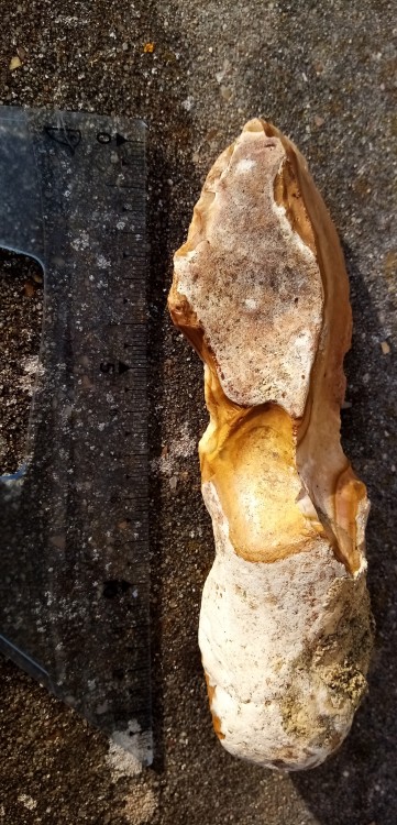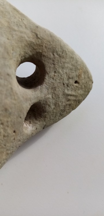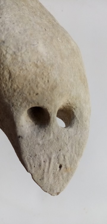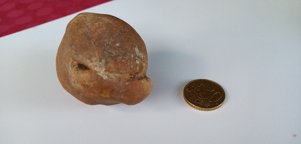 Une pierre originale. Une forme naturelle peut-être réemployée ? Qu'en pensez-vous ? Des stries sur le nez et des encoches courbées seulement au dessus de la pierre. 445 g. 16*9 cm Trouvée enterrée parmi des silex dans le 77, Fontainebleau.
