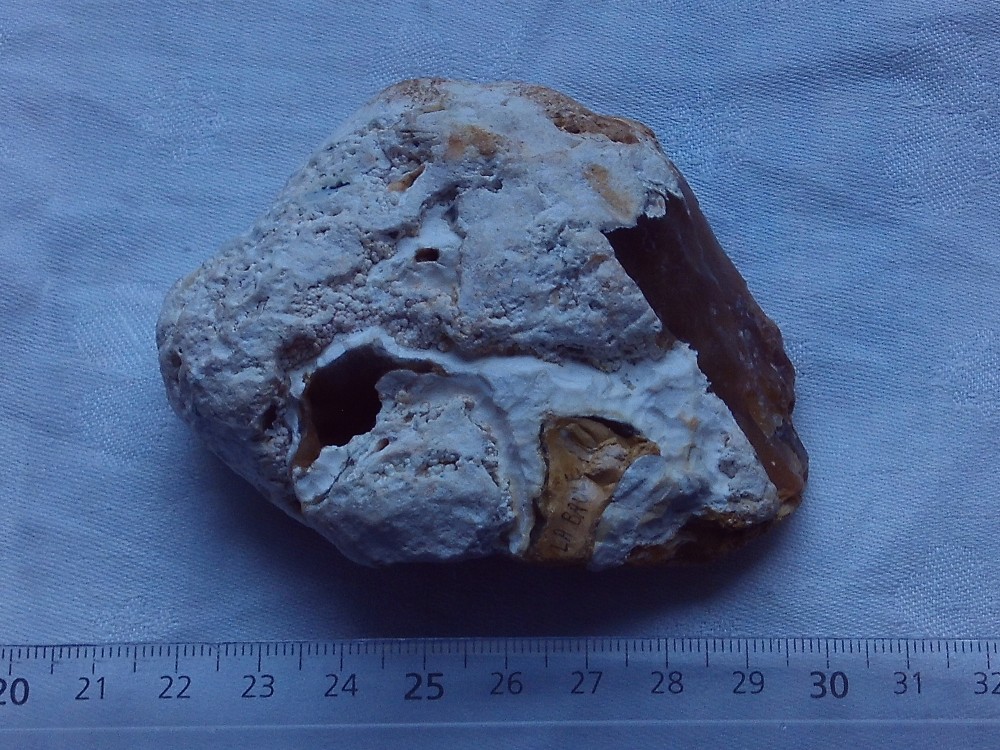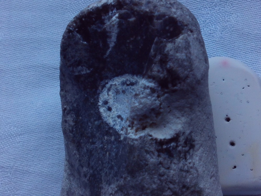 Bonjour, ci-jointe une calcite de Fontainebleau qui m'avait été donnée, il y a bien longtemps par les membres du club du même nom, lors de leur visite de la carrière du lutétien de Bouxwiller. Il me sembles que ces calcites soient assez rarement fossilifères ? Celle-ci a intégré un galet à priori de calcaire et qui a été percé par des lithophages et des vers. -