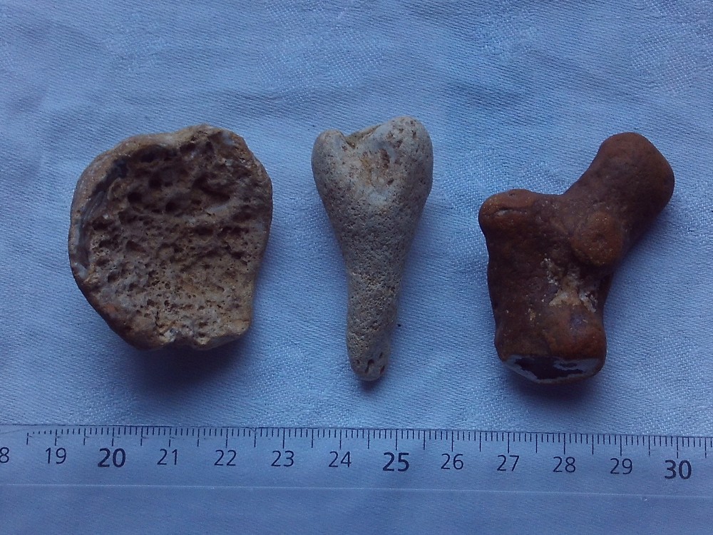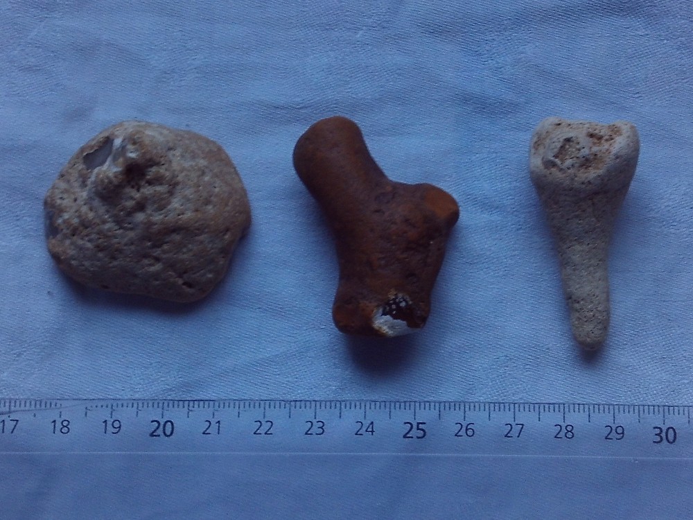 Paréidolies … ou peut être pas, il est parfois difficile de trancher, mais le doute ne fait-il pas progresser ? Ces quelques bizarreries ont été trouvées, en trois années, lors de mes balades sur la plage de La Baule (44) suite au creusements de trous par des gamins en vacances. Ces creusements vont jusque sous les sables fins pour atteindre des sables plus grossiers avec divers galets. Une année il y avait même des morceaux presque décimétriques de quartz blanc, mais les nettoyeurs communaux ont du les enlever . La tête de « poisson » en silice (3,4 cm) montre, à droite de la photo, comme des dentelures qui sont en fait un bivalve fossile (cardium ?) en coupe. J'ai jeté la tête de « cheval » en silex (4,4 cm) après l'avoir ramassée deux jours de suite avant de ma décider à la garder le troisième jour à nouveau intrigué par sa forme. La lame de silex (4,6 cm) est assez érodée mais devrait être un racloir néolithique (?). Le gastéropode fossile en silice (4,5 cm) ne vient pas de cet endroit où ne sont présents que des bouts de coraux et d'éponges bien érodés. Le trou dans ce fossile (volontaire?) a du être complet avant qu'une partie plus fine ne casse. Je n'attends pas forcément de réponses, car j'ouvre ce post pour toutes les bizarreries que la nature nous offre. Bonnes fêtes à tous et à toutes et à vous de jouer.