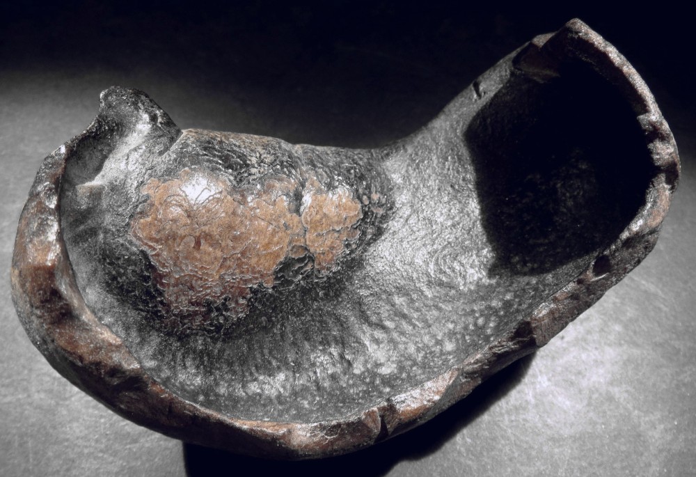 Un autre fossile exceptionnel à mon sens. C'est un otolithe de baleine de Caroline du sud (USA) qui a été "grignoté" par un animal (mammifère !) dont on voit à gauche les traces des dents et à droite la trace des griffes de sa patte droite. Mais comme les otolithes sont relativement durs, une dent a cassé et 2 fragments millimétriques sont restés incrustés. La bulle tympanique de la baleine et les bouts de dents ont été fossilisés ... puis un amérindien préhistorique l'a utilisé comme lame à encoche notamment pour écorcer des branches. La partie centrale montre une usure importante dans l'axe de l'encoche principale. -