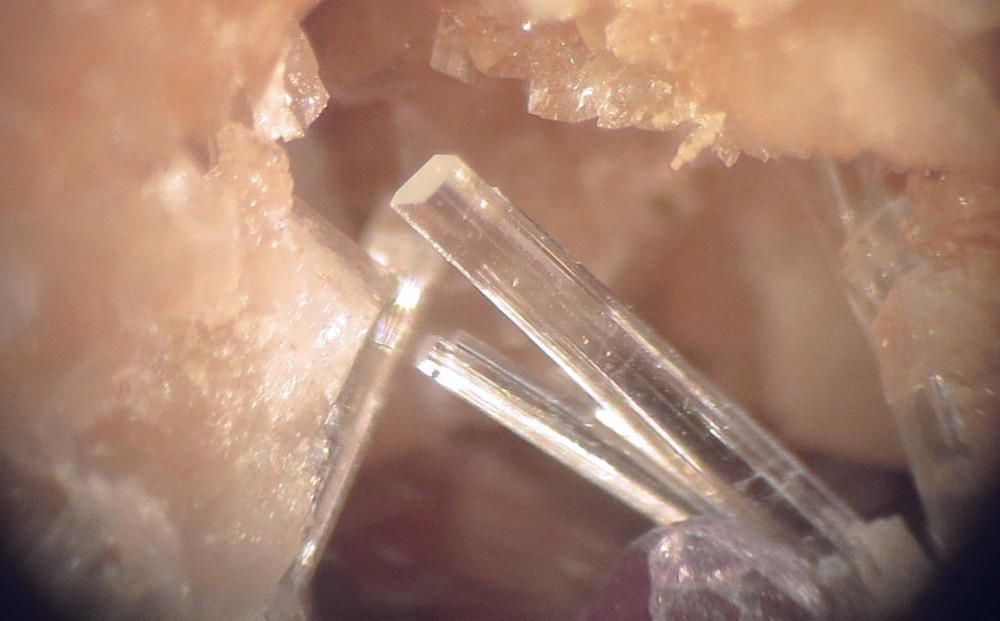 Bonjour, plus deux exemples peu courants ! Une pseudomorphose de Chiastolite (Andalousite) en Disthène confirmée par le test de dureté (de Boal en Espagne). Un pseudomorphose de petits (quelques mm) cristaux de Béryl en Phénacite. La baguette hexagonale montre des microcristaux orientés en biais par rapport à l'axe. Seulement quelques exemplaires ont été trouvés au contact entre une zone à Béryl et une zone à Phénacite. -