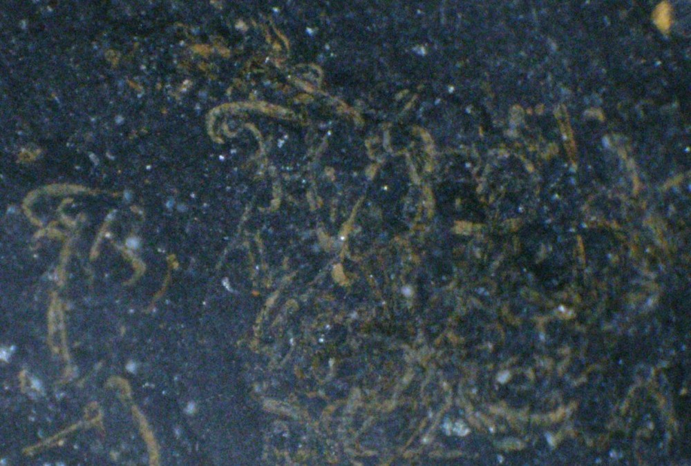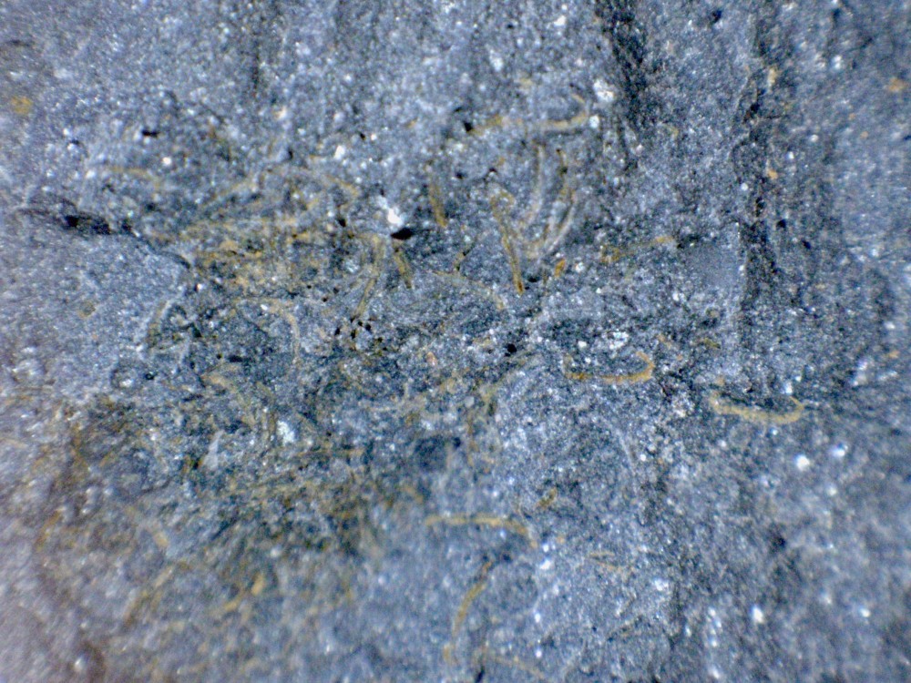 Il est composé de petits éléments ayant 0,5 mm de long, de couleur rouille (par altération de la pyrite ?) et en creux, dans cette roche siliceuse noire.