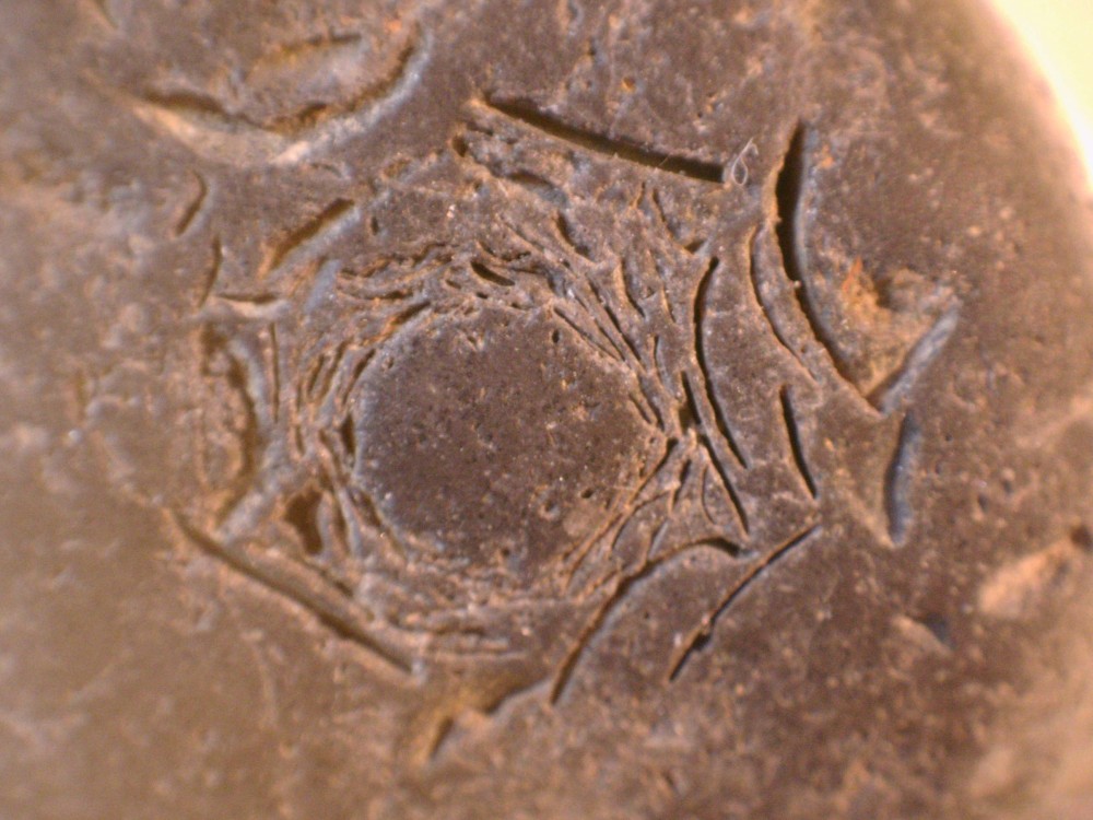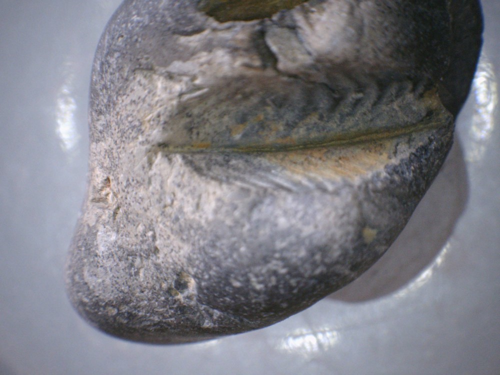 17. Bonjour, voici une nouvelle énigme en surface d'un galet du dévonien. A côté de l'empreinte de la carène d'un céphalopode, avec une forme discoïde et des côtes flexueuses (probable Anarcertida), j'ai découvert une structure avec un centre assez circulaire et entouré de débris de bivalves. Ceux-ci sont petits et très fins autour de ce centre (terrier ?) et sont de plus en plus grands en s'en éloignant avec la partie concave tournée vers l'extérieur. Cet assemblage n'est visiblement pas le fait du hasard. Terrier de ver, de crustacé ou autre chose ? Merci pour vos avis !