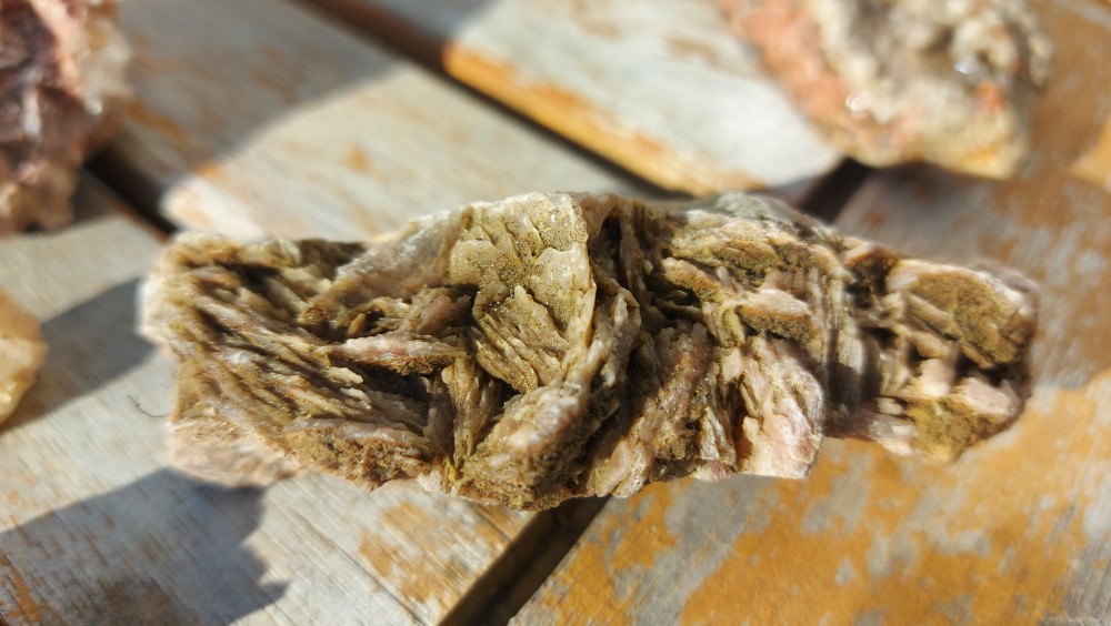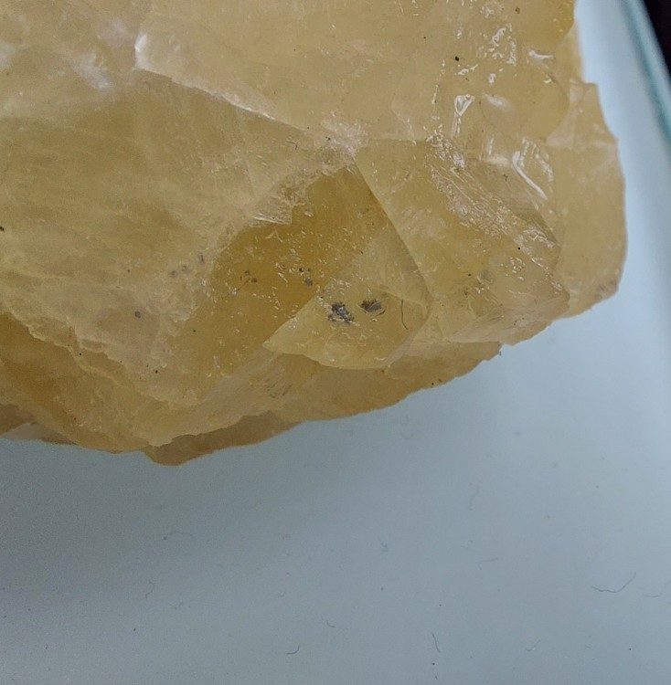 Petite question suite a une fouille récente des déblais. J'ai trouvé ceci qui ressemble fort a une barytine, mais il y a des petites inclusions, qui ont un reflet métallique a l'intérieur (cf photo). Quelqu'un a une idée? -