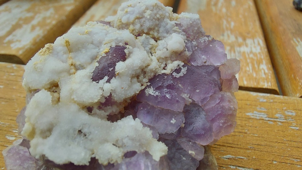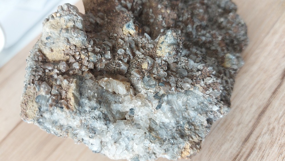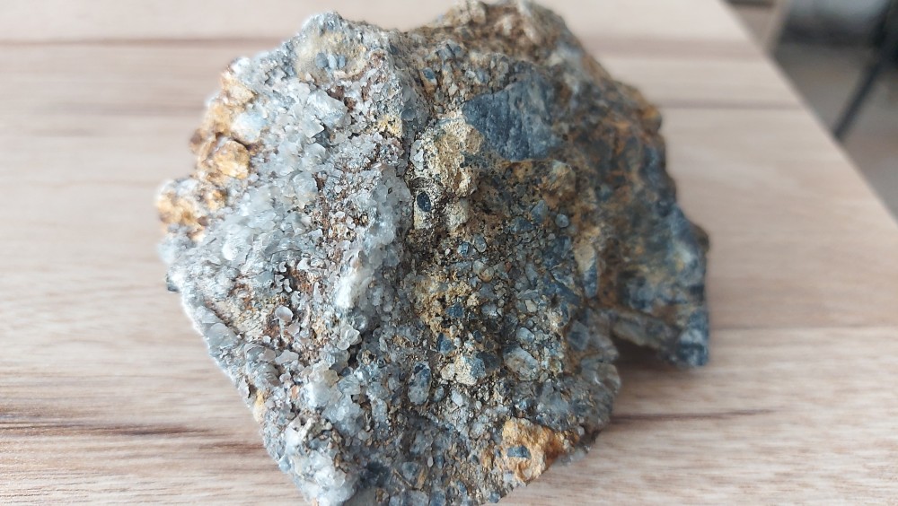 Et une dernière, fluo et galène trouvée lors de ma première visite. On n'avait trouvé le site principale au moment de partir. Mais on était tombé sur des travaux de déboisement / débardage avec de la terre retournée. On avait trouvé cette pièce en creusant un peu😀, et quelques carottes de forage, témoin des anciennes prospections. Il en reste au bord du chemin d'ailleurs.