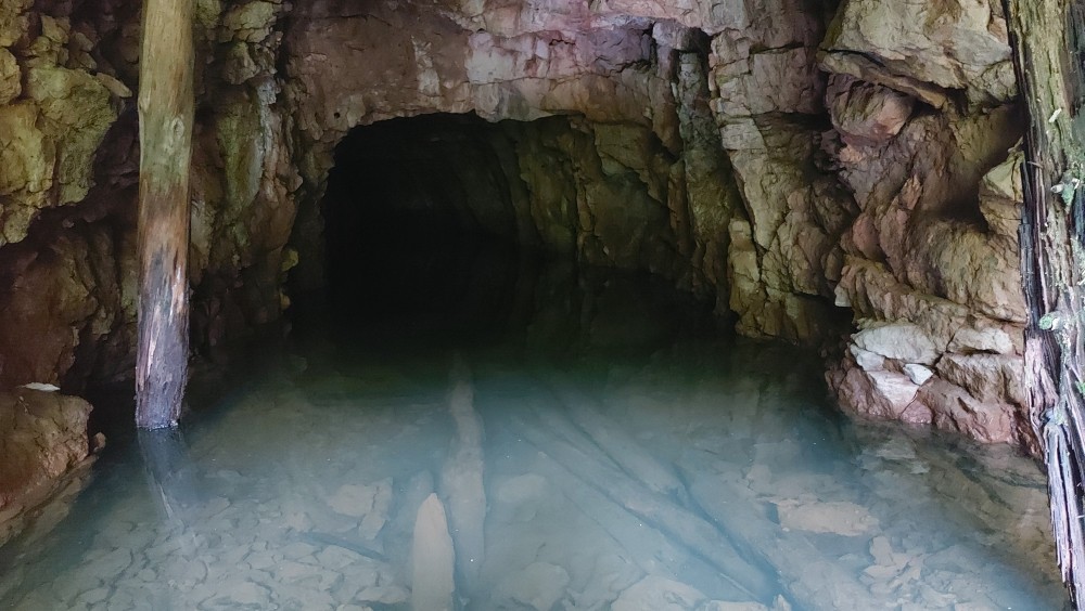 Jeux d'ombre et de lumière a l'entrée. Je ne suis pas allé plus loin, car les frontales avaient été oubliées et je n'avais pas les bottes.....🌫️ On voit aussi les madriers effondrés dans l'eau. A l'entrée, il y avait également quelques restes d'une sorte d'échelle rouillée (ou pour arrêter les wagons?). -