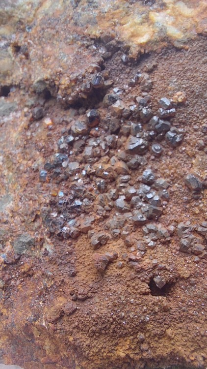 Hello! Je rebondis sur les interrogations de @KCM concernant le minerais noir friable. Il y a pleins de petites géodes de cristaux très sombre de ce type a la sanguinède (encore un peu de brosse a dent a sec + humide pour mieux voir). Avec effectivement parfois des choses oxydés (fer?), ou même passé au four pour extraction? Je me demande du coup ce que sont ces cristallisation. J'aurais dit blende (plutôt que pyrite). Merci de vos retours et de votre aide! A+ PS: les cèdres en face, c'est a peu près le même type de minéralisation :). Mais j'ai quelques reflets sympas non vus sur ceux de la sanguinède. Je vais essayer de poster sur un topic des cèdres. -