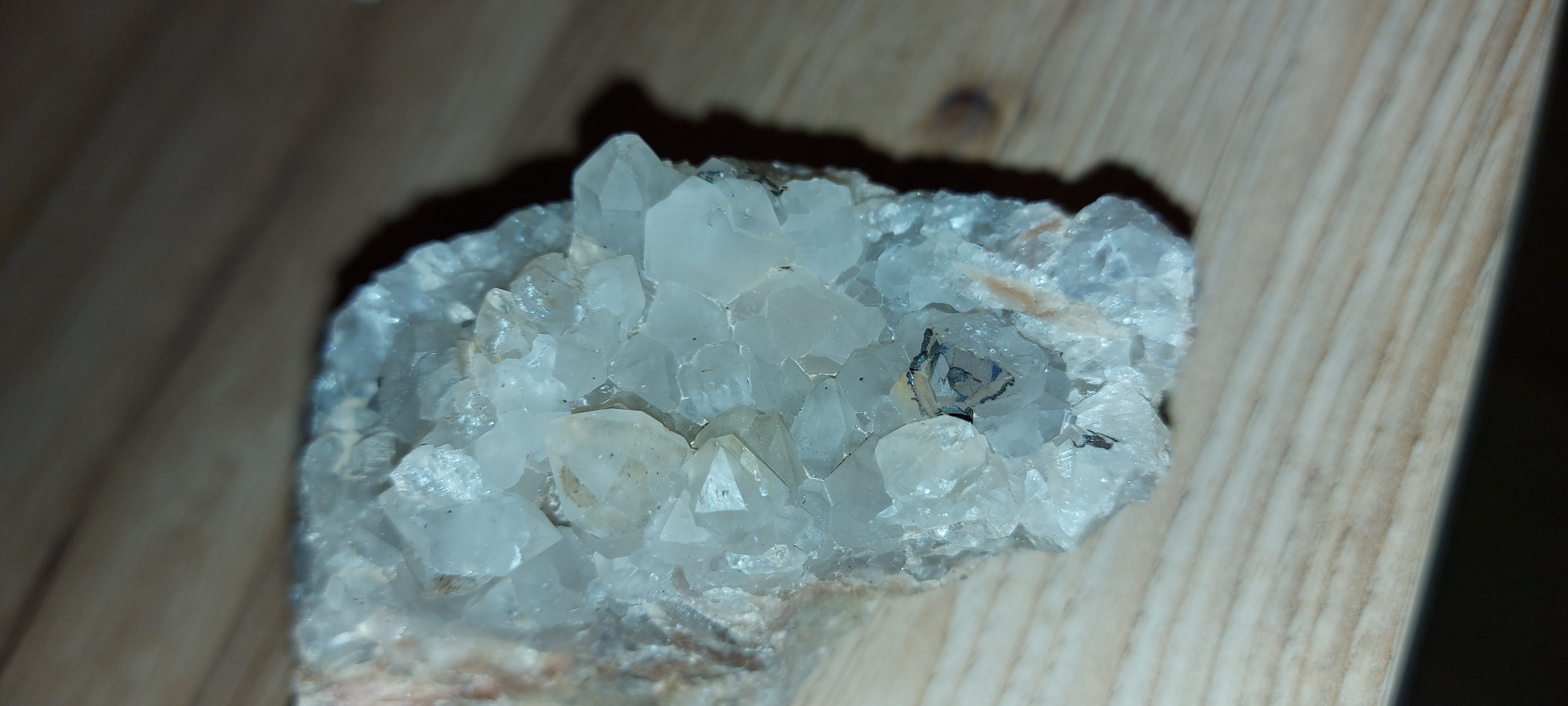 Bonjour a tous Petite question identification sur ceci trouvé dans le Dyke de Faymont. Ca me fait penser a du quartz légèrement améthysté. La poche était minuscule. Ne réagit pas au test HCl. Merci d'avance!