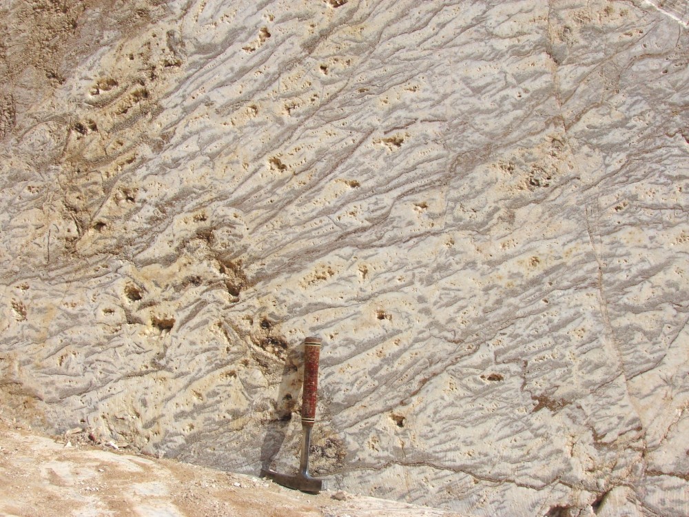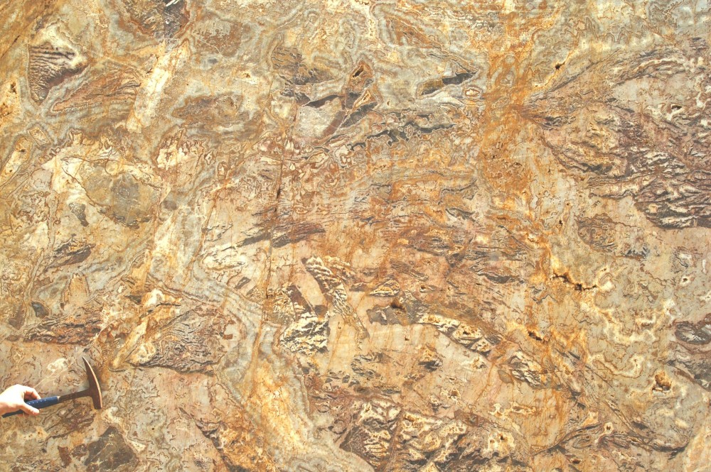Je poursuis la visite avec la présentation de l'amphiteatre. Sur le site d'une ancienne carriere de dolomie, située à l'entrée des grottes, nous avons assisté à sa construction : Les parements ont été scies (mais pas polis quand meme...) et donnent à voir le corps dolomitique principal sous plusieurs angles ; c'est magique et une aubaine pour les géologues, beaucoup mieux qu'une tranchée de route ou une galerie de mine... Et maintenant quelques exemples de ce qu'on y voit : Breches, zebras, filons et remplissages de cavités, dans la dolomie tout est bon... -